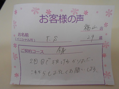 F.Sさんこんにちは(^v^) いつもご来店頂きありがとうございます。 早くも毛の抜け感を実感いただいて嬉しいですヽ(^o^)丿 これからも一緒に綺麗にしていきましょう!!