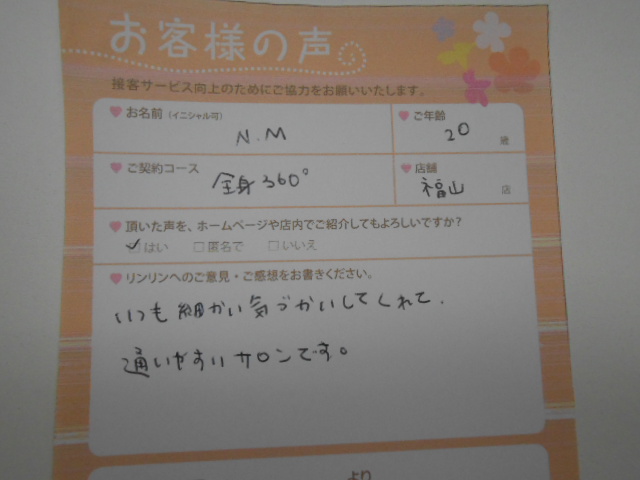 N,M様、本日もご来店ありがとうございます(*'▽') この季節、アイスノン出のお冷しが一層冷たくしんどかったですよね。頑張って頂きありがとうございます。 これからも皆様が通いやすいサロンにするため努力致しますので、宜しくお願い致します。