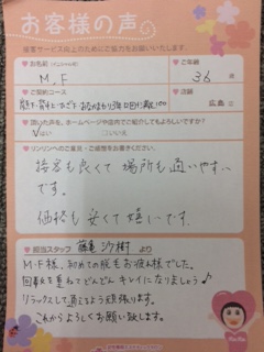 M・F様、初めての脱毛お疲れ様でした。回数を重ねてどんどんキレイになりましょう♪リラックスして通えるよう頑張ります。これからもよろしくお願い致します。
