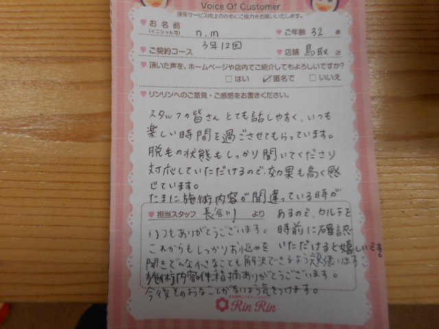 いつもありがとうございます。これからもしっかりお悩みを聞きどんな小さなことも解決できるよう頑張ります。施術内容の件ご指摘ありがとうございます。今後そのようなことがないよう気を付けます。