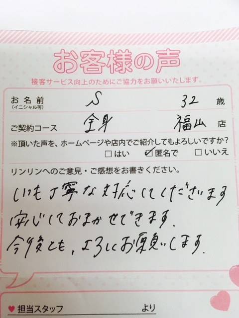 ご来店ありがとうございました( ^)o(^ ) 最後まで安心して通って頂けるように精一杯お手伝いさせていただきます! これからもリンリン福山店を宜しくお願い致します('◇')ゞ