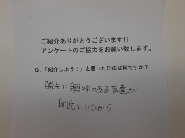 お友だちご紹介頂きありがとうございます。 身近の方で毛にお悩みでしたら是非私たちにご相談ください。
