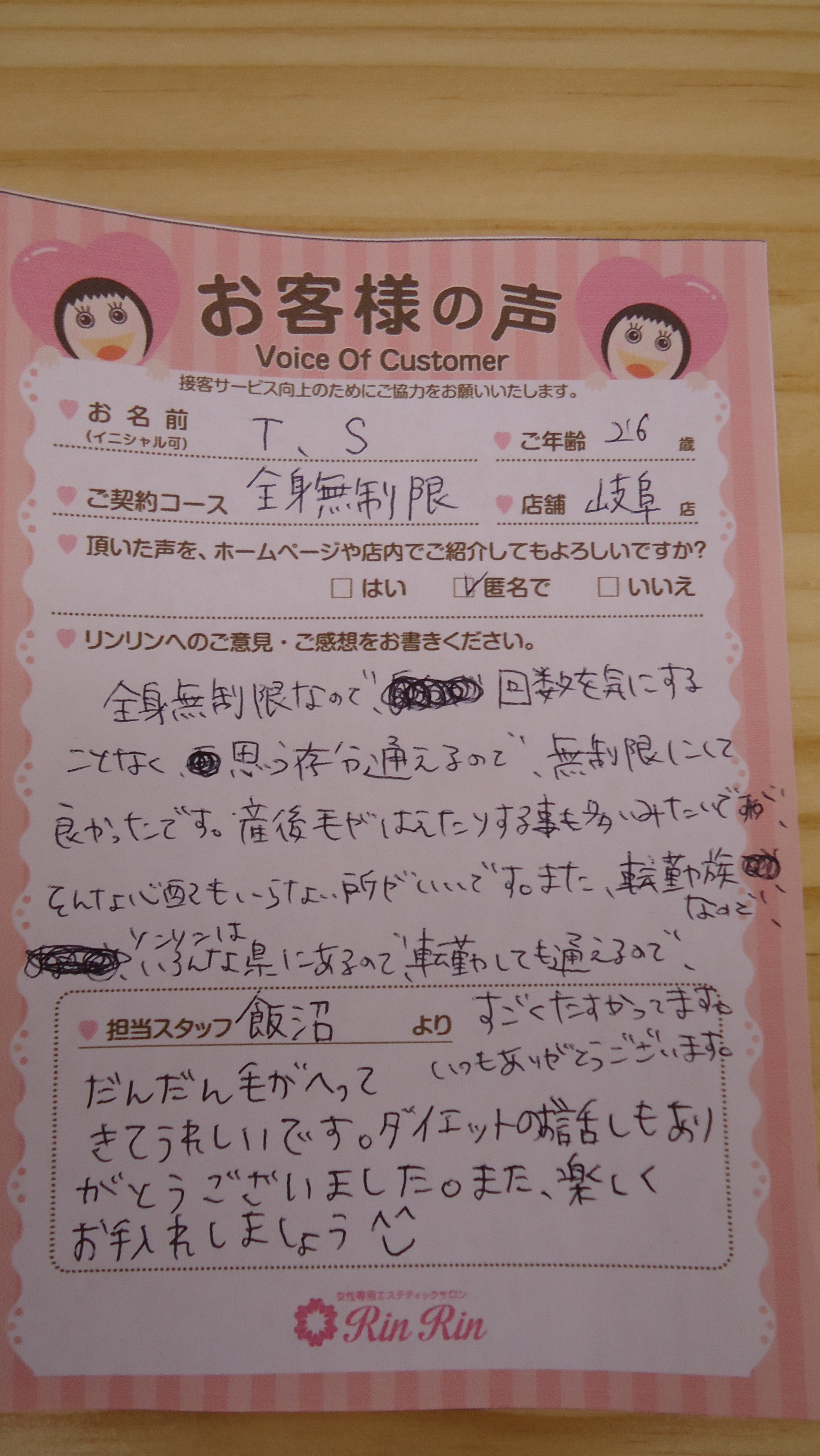 いつもご来店ありがとうございます。 毛がはえるペースも遅くなってきたみたいで、すごくうれしいです。 また、どんどんキレイになるように、私も頑張ります。
