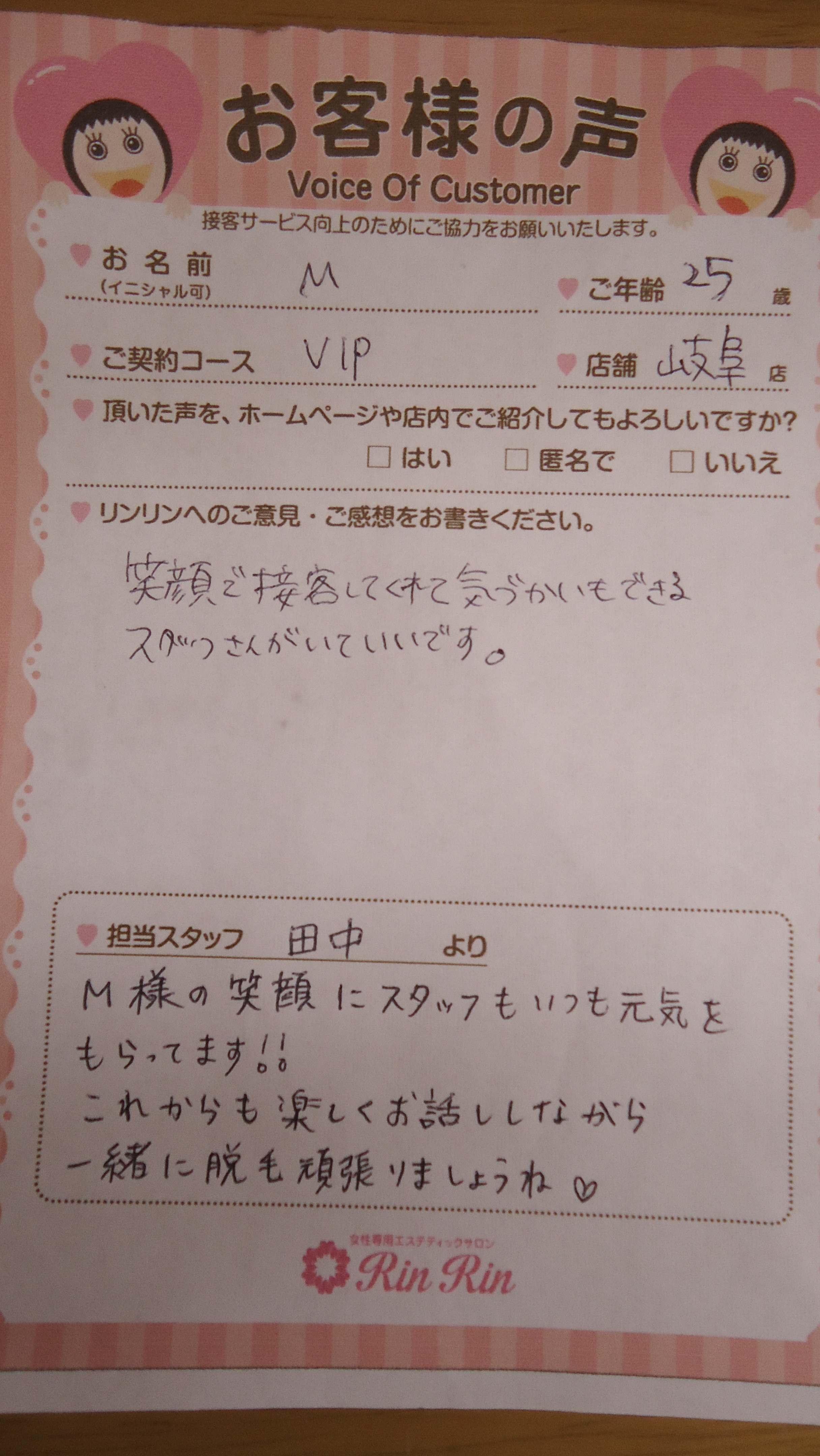 M様の笑顔にスタッフもいつも元気をもらってます!! これからも楽しくお話ししながら一緒に脱毛頑張りましょうね♡