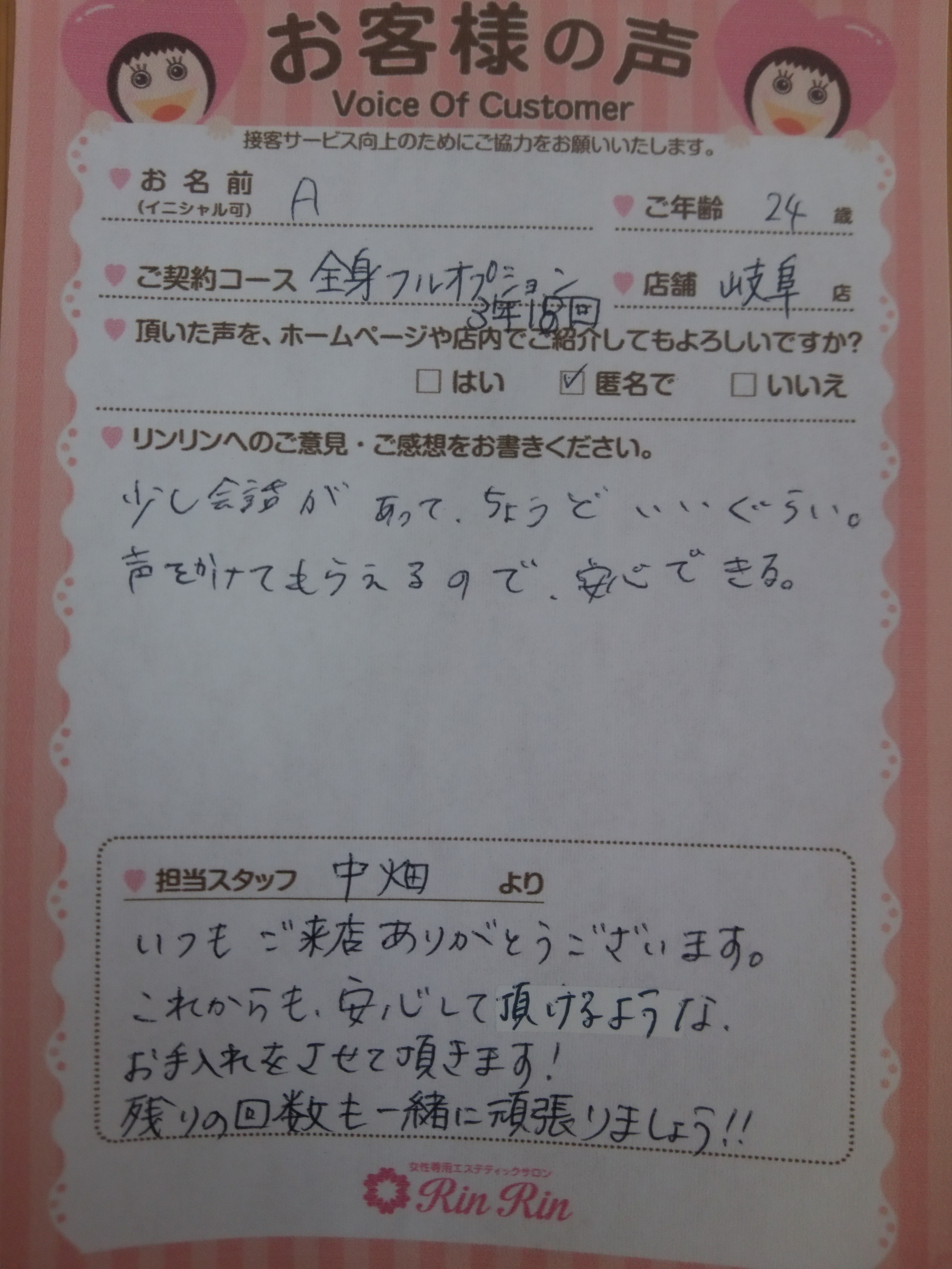 いつもご来店ありがとうございます。 これからも、安心して頂けるように、お手入れさせて頂きます。 残りの回数も一緒に頑張りましょう!