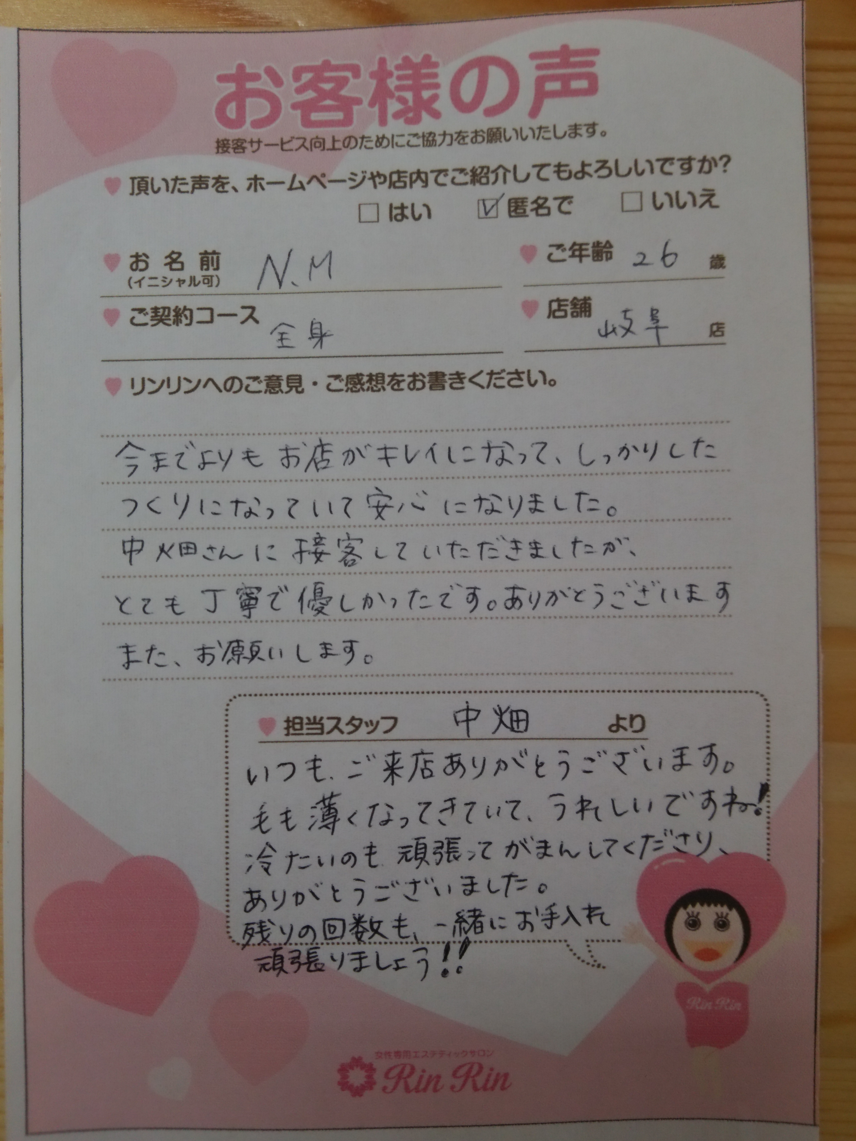 T様 いつもありがとうございます。 嬉しいお声を頂き、感謝致します。 いつも楽しいお話しをさせて頂いて、嬉しく思っております! また、次回も気になるヵ所を重点的にしっかり施術させて頂きたいと思いますので、 よろしくお願い致します。 ありがとうございました。 岐阜店 スタッフより