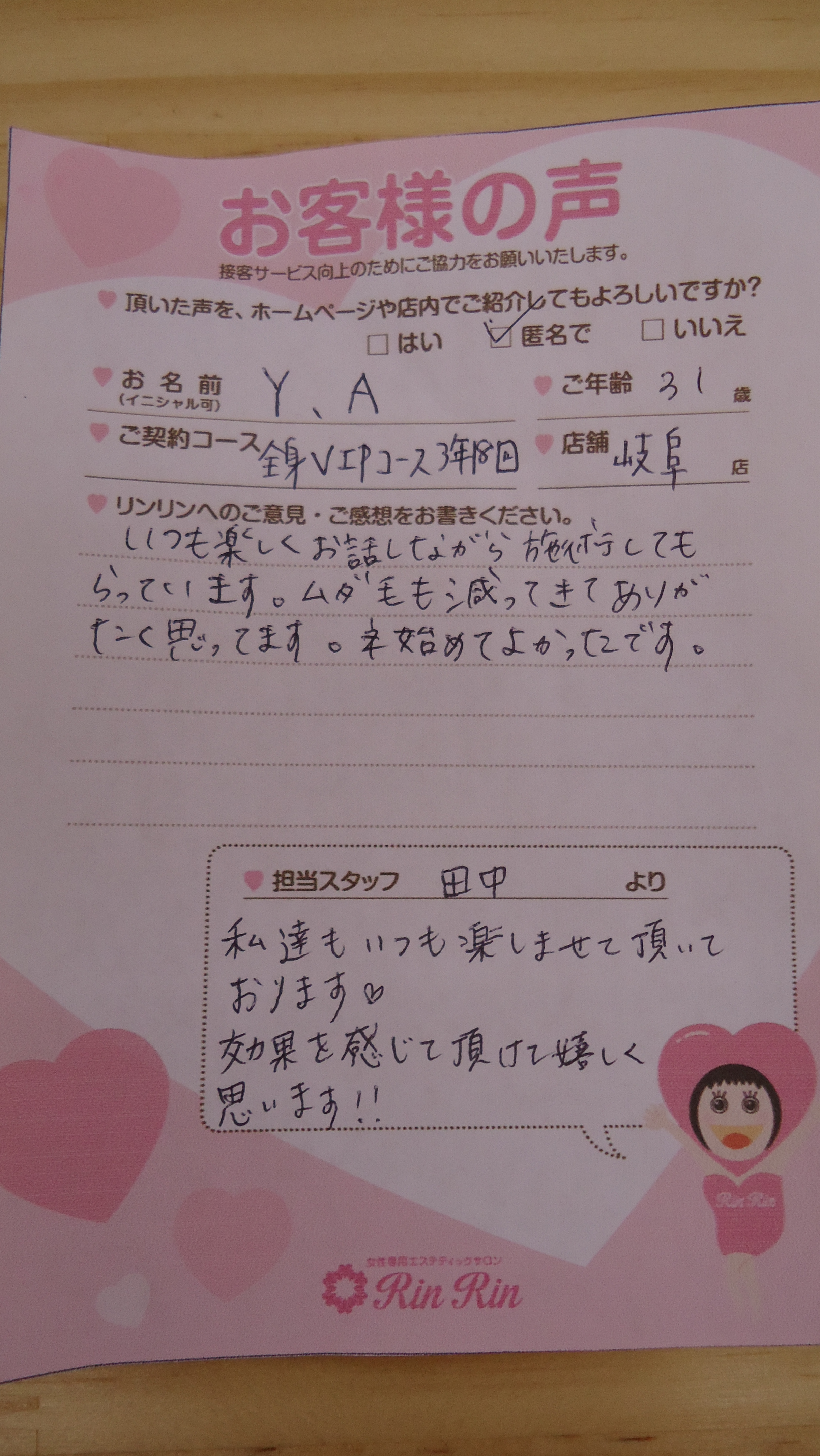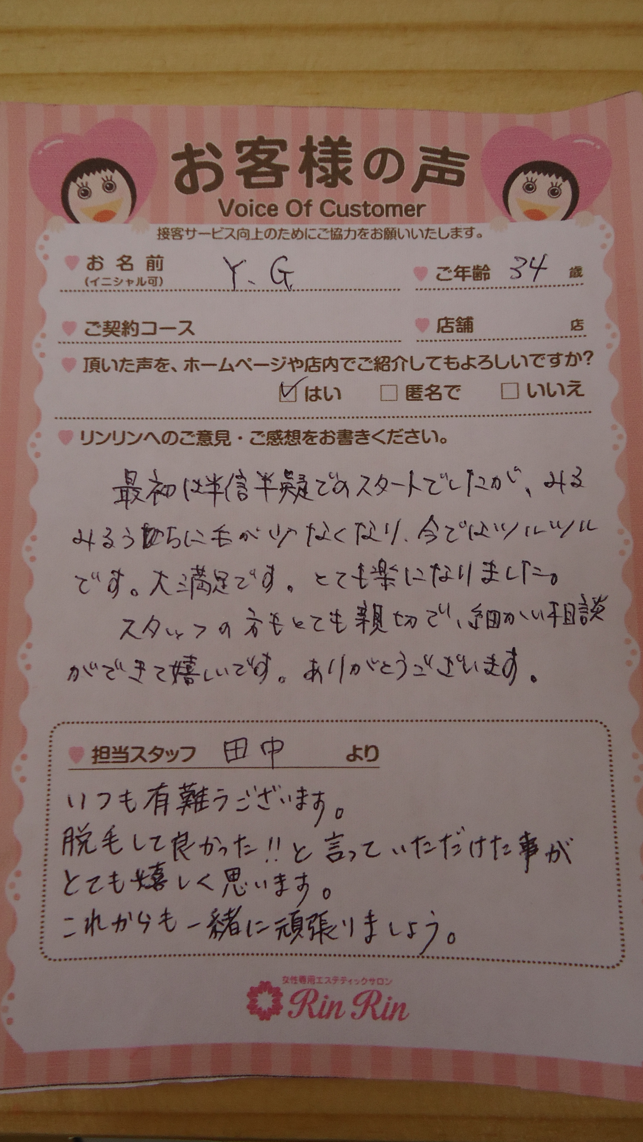 いつもありがとうございます。 お手入れに入るスタッフの人数、今後、気をつけます。 これからも、リラックスして楽しくお手入れを受けて頂けるよう、頑張ります。