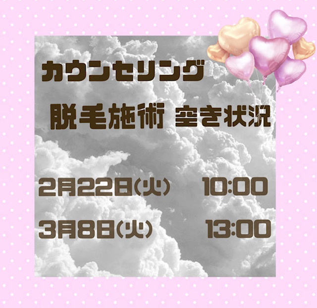 VIOライン・デリケートゾーン アンダーヘア・ビキニライン キャンペーン スタッフブログ その他 ブライダル♪ ワキ脱毛・脇 光・フラッシュ脱毛 全身脱毛 毛・ムダ毛の悩み 浜松 脱毛 浜松店のカテゴリ 背中・腕・胸 脱毛キャンペーン 脱毛サイクル・脱毛効果 脱毛サロン 脱毛体験・相談 足・ひざ・膝下 顔・フェイス・うなじ・首カウンセリングの空きでました!