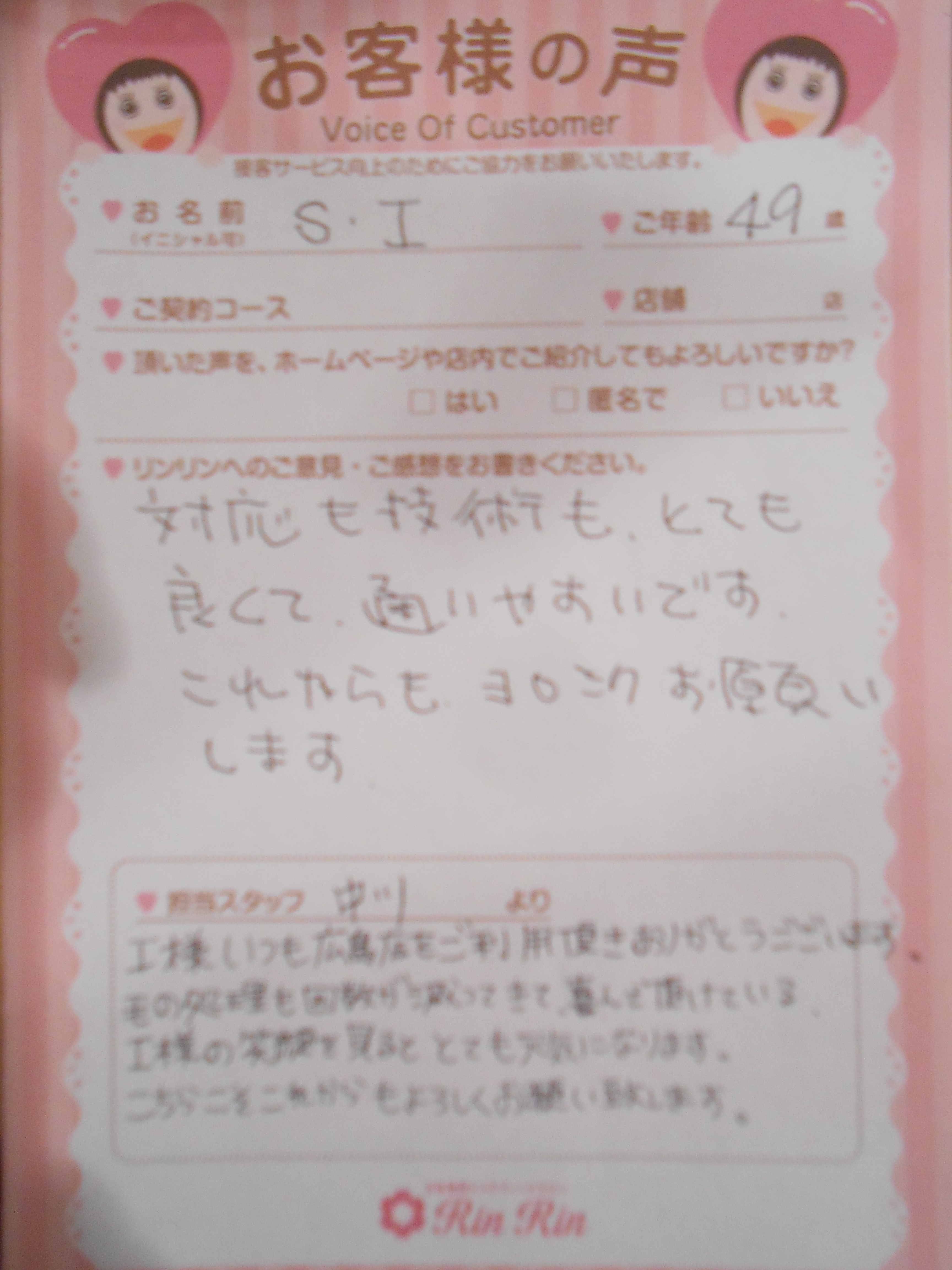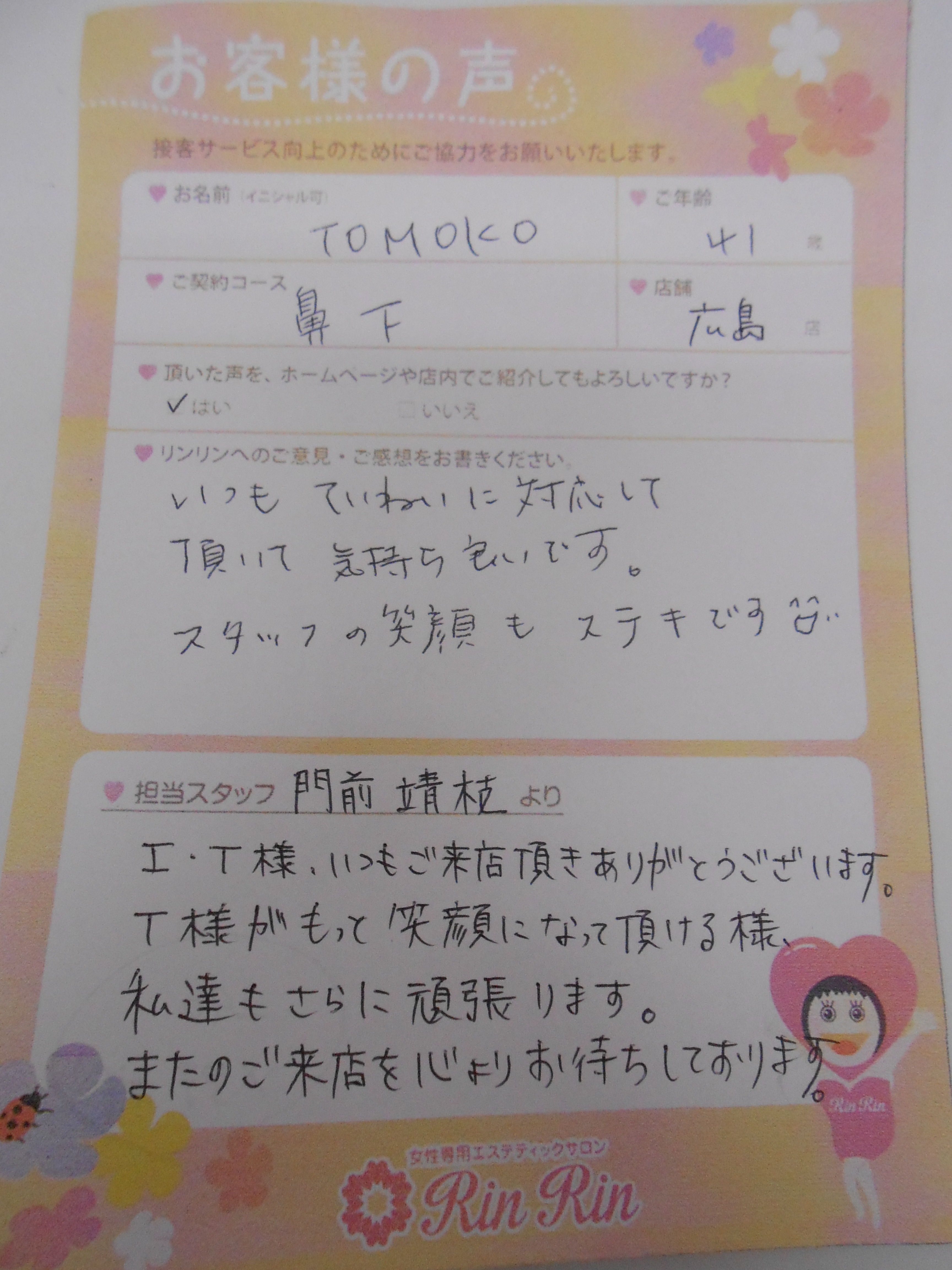 I様いつも広島店をご利用いただきありがとうございます。 毛の処理も回数が減ってきて喜んでいただけている I様の笑顔を見るととても元気になります。 こちらこそこれからもよろしくお願い致します。