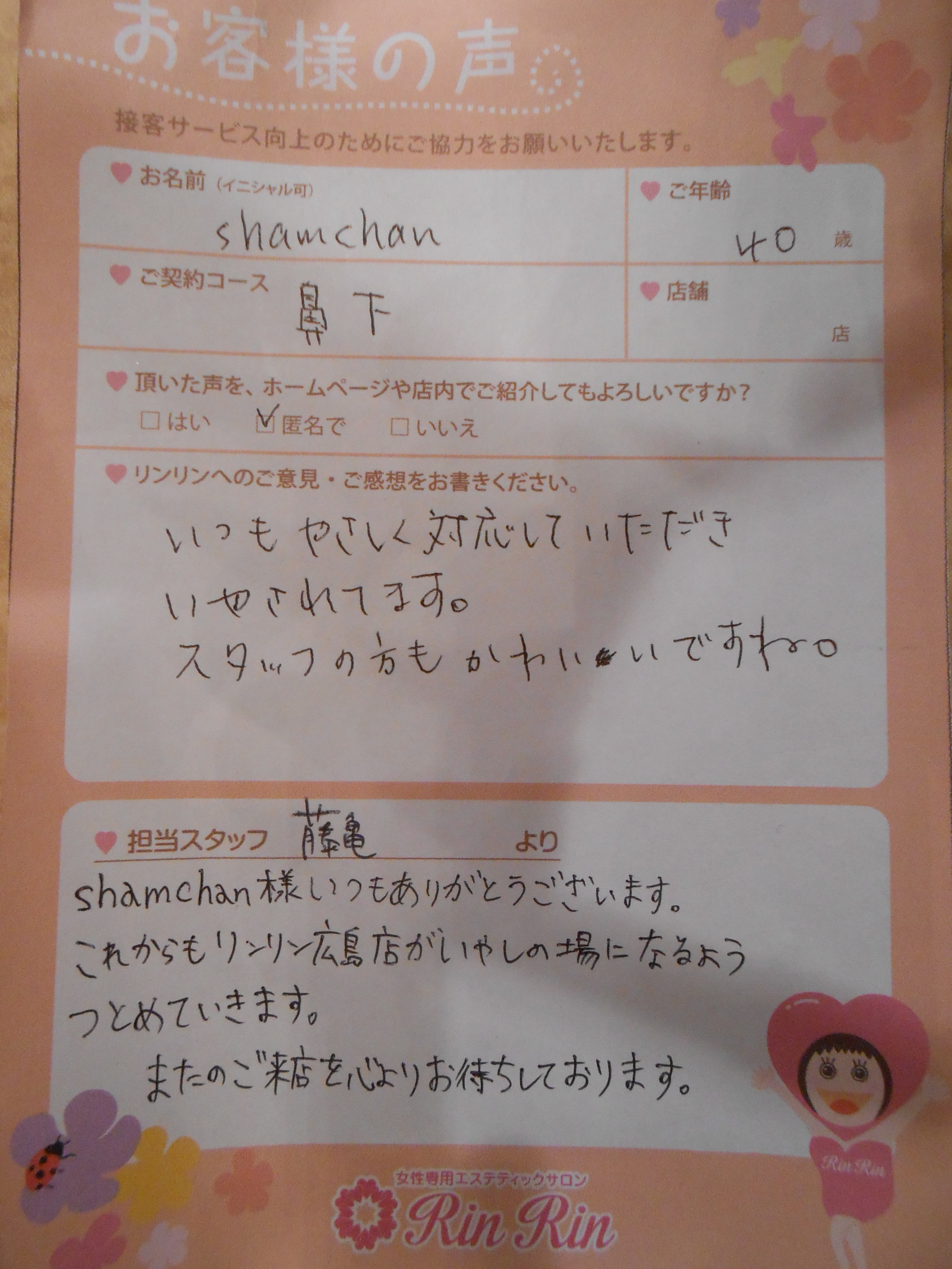 shamchan様いつもありがとうございます。 これからもリンリン広島店がいやしの場になるよう努めていきます。 またのご来店を心よりお待ちしております。