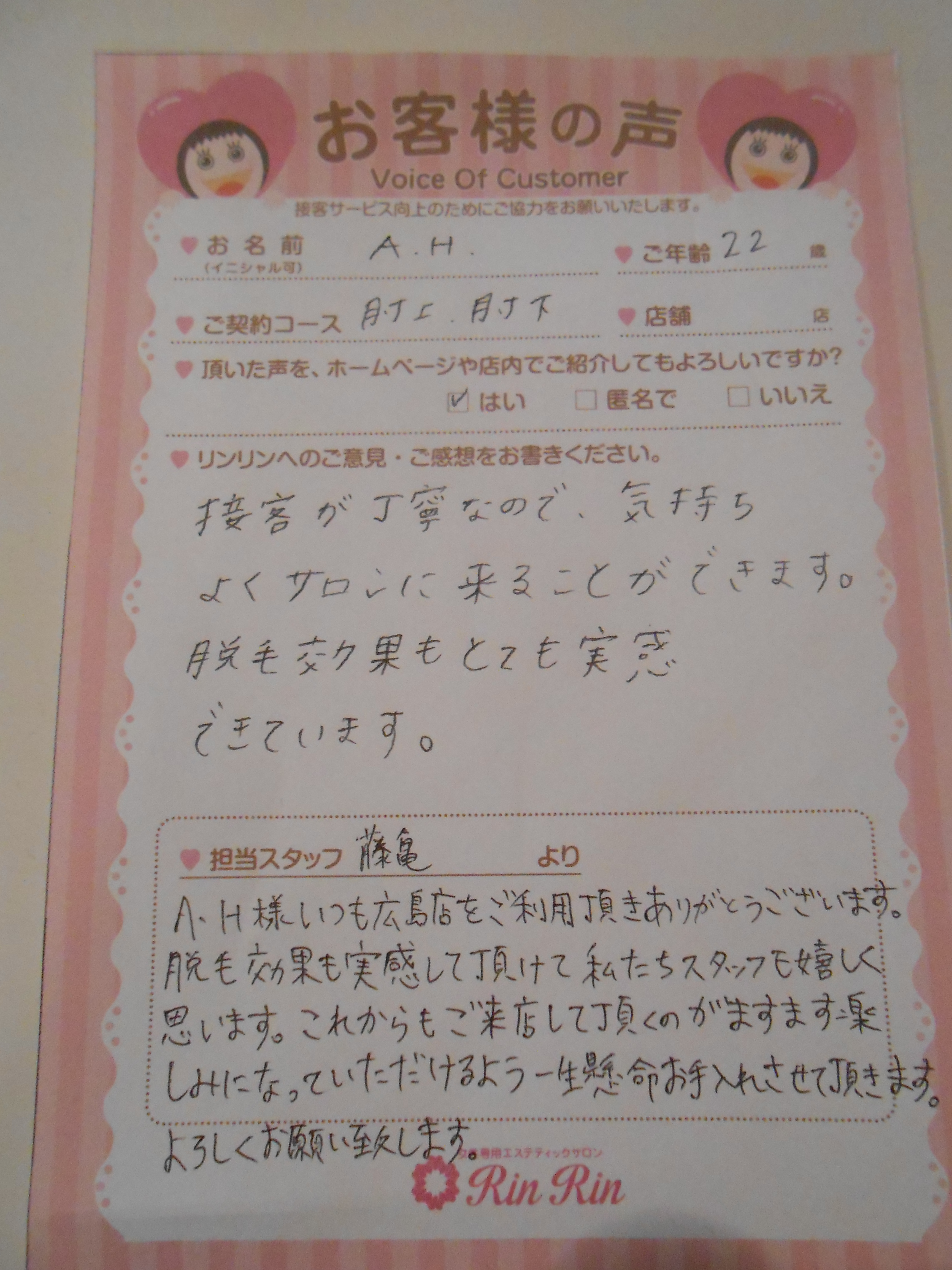 無駄毛になやんでいました。そして、2日か3日に一回はカミソリで剃っていて肌もぼろぼろ。そんなとき、チラシを見てリンリン広島店に行ってみました!今脱毛を始めて1年目ぐらいですが、効果もありカミソリの回数が減ったことで肌もきれいになりました!みんなも悩んでいるなら早くから脱毛した方がいいと思いますよ♪わたしは、大満足です\(^o^)/リンリンさんありがとう!!