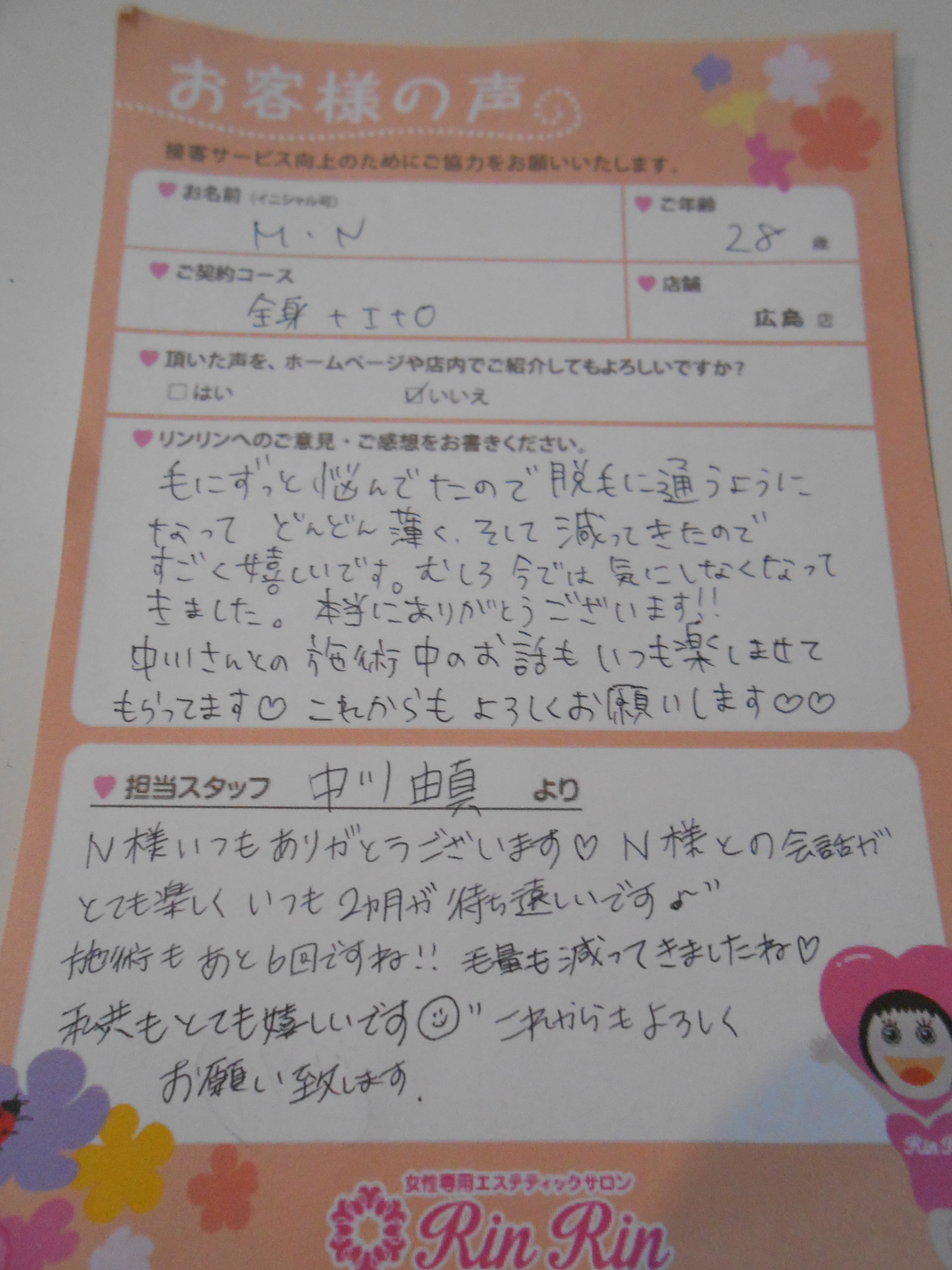 N様ありがとうございます^^ 毛が減るととっても楽ですよね!! 回数重ねていくごとにきれいになっていきますので これからが楽しみですね^^ これからもスタッフ一同N様がより一層きれいになるよう お手伝いしていきますのでよろしくお願い致します♪