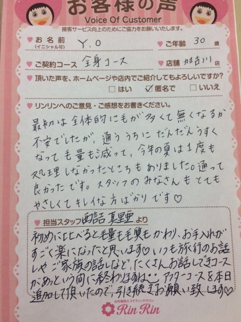 最初は全体的に毛が多くて無くなるか不安でしたが、通ううちにだんだんうすくなって毛量も減って、今年の夏は1度も処理しなかったところもありました。通って良かったです。スタッフのみなさんもとてもやさしくてキレイな方ばかりです。