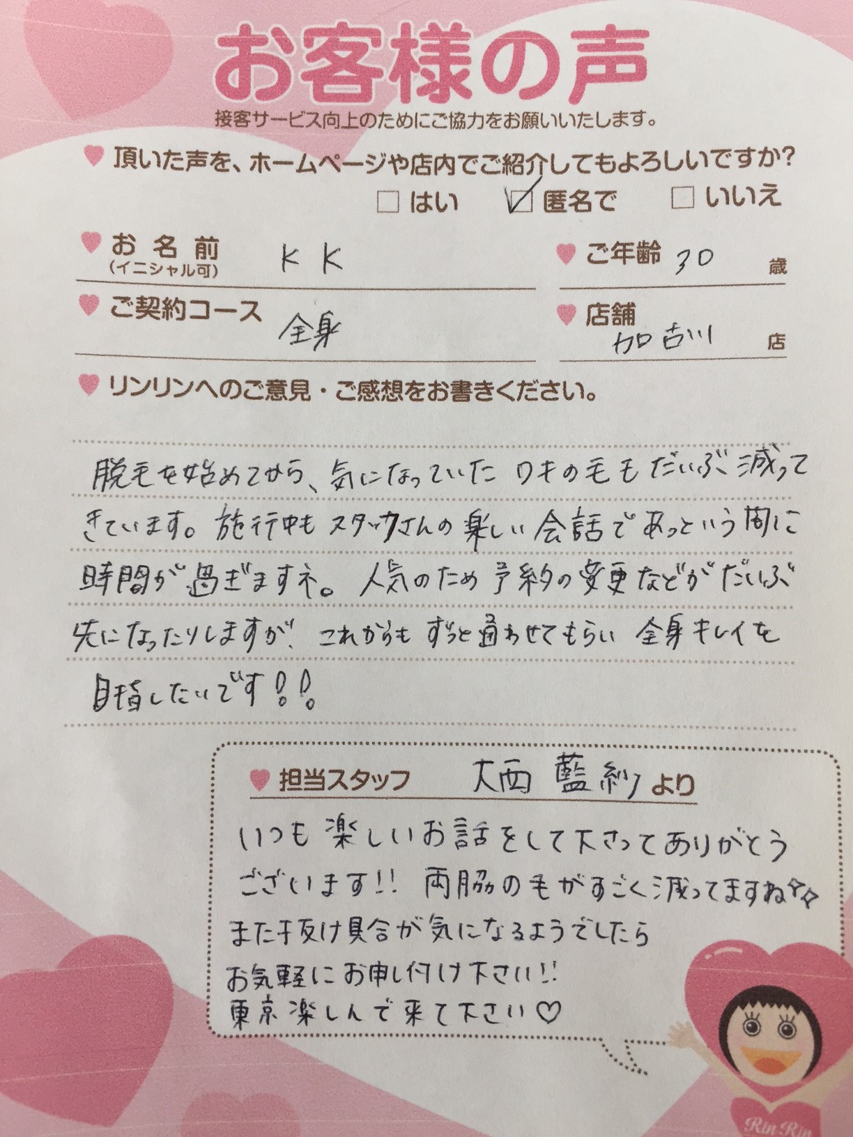 本日も沢山お話しして下さりありがとうございます! 次回もK様のお話しを沢山聞かせて下さい♬ 良いお年を…(*^_^*)