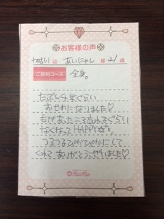 アイにゃん様 今日まで4年間本当にありがとうございました(^_^) あっという間でしたね(^_^) まだ17歳だったころが嘘のように大人な女性になりましたね♡ 脱毛効果も満足して頂けたこと、綺麗になるお手伝いさせて頂けたことに 感謝しています☆ お姉さんとまた一緒にご来店して、明るい笑顔を見せに来て下さいね(^_^) お待ちしております♪