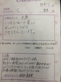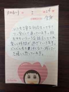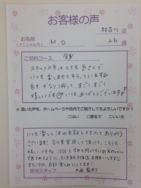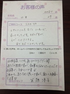 I様 本日はご来店ありがとうございます。 だいぶ効果も出てきていますね♪ 次回もまた楽しみにしています(^_^)