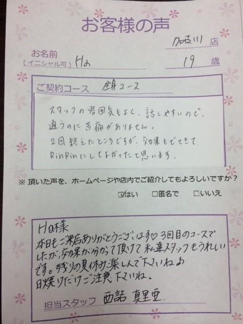 本日はご来店ありがとうございます(^o^)丿 次回で脇とヒジ下、ヒザ下がラストになります。効果もかなり出てきていますね♡ 嬉しいです(^_^) お祭りのお手伝い頑張ってくださいね♪