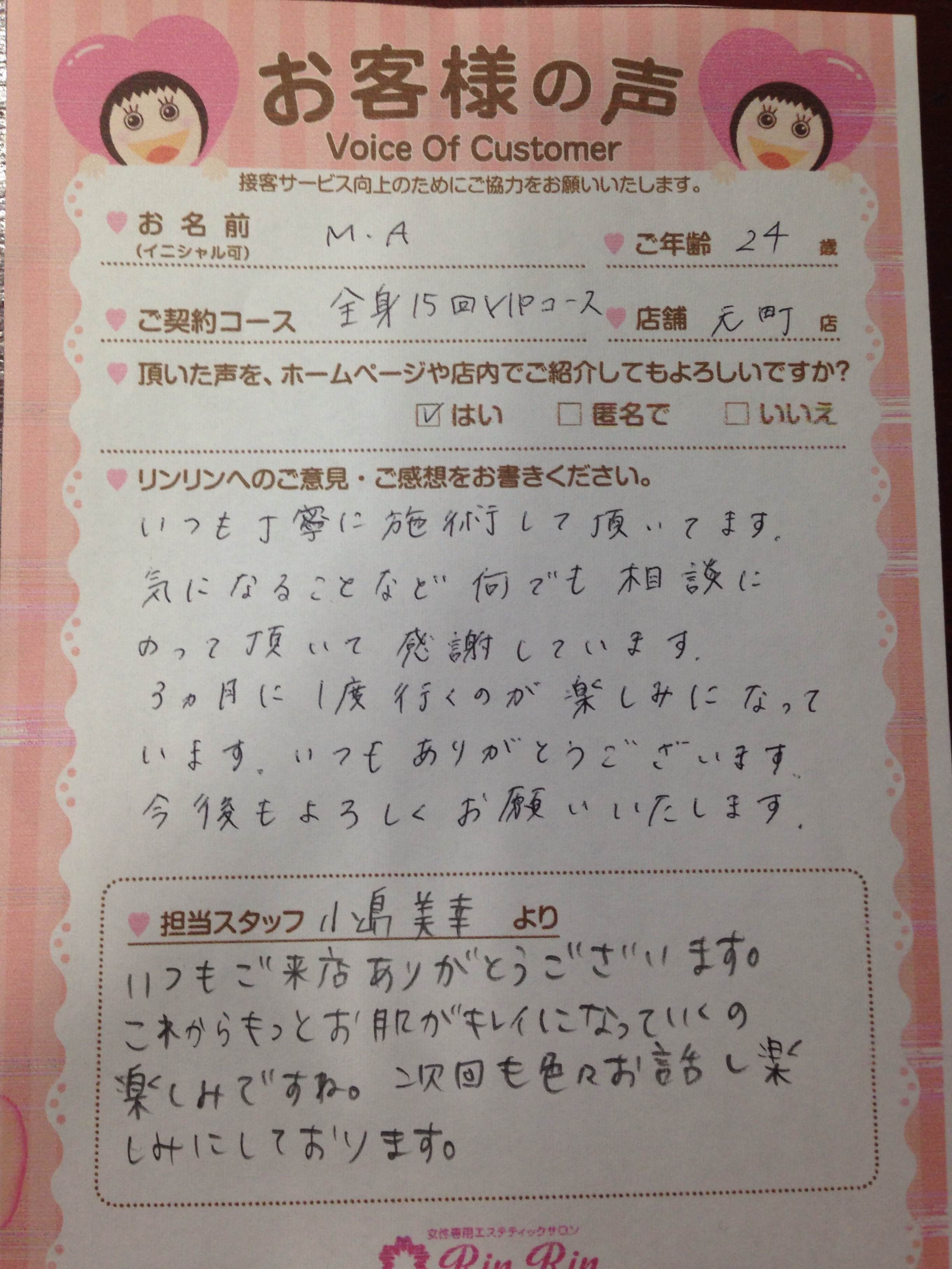 いつも丁寧に施術して頂いてます。気になることなどなんでも相談にのって頂いて感謝しています。3ヶ月に1度行くのが楽しみになっています。いつもありがとうございます。今後もよろしくお願いします。