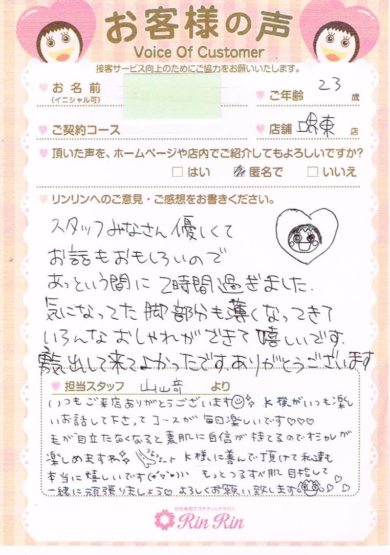 T.T様いつもご来店ありがとうございます!今回でひざ下3回目のコースでした。2回目より効果が出ておりすごく嬉しいです♥いつもお仕事に子育てやお弁当作りを頑張ってるT.T様にすごく尊敬してます!これからもどんどんキレイになっていくのが楽しみです!次回のご来店も楽しみにお待ちしております(*^_^*)
