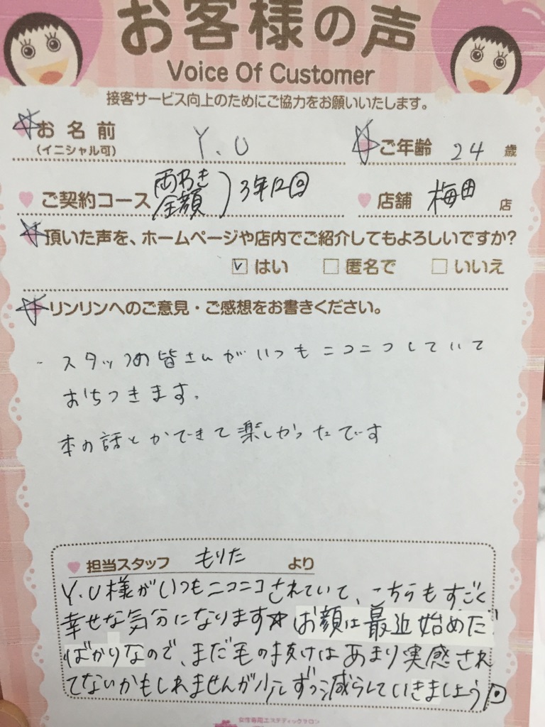 いつもニコニコされていてこちらもすごく幸せな気分になります☆お顔は最近始めたばかりなのでまだ、毛の抜けはあまり実感されていないかもしれませんが少しづつ減らしていきましょう~!!!