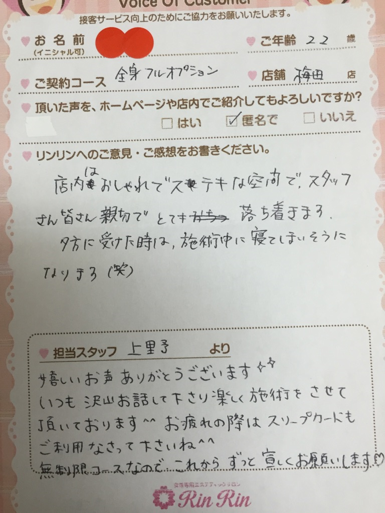 嬉しいお声ありがとうございます★ いつも楽しくお話しして下さり楽しく施術させて頂いております^^ お疲れの際はスリープカードもご利用なさってくださいね^^ 無制限コースなのでこれからずっと、よろしくお願いします♡