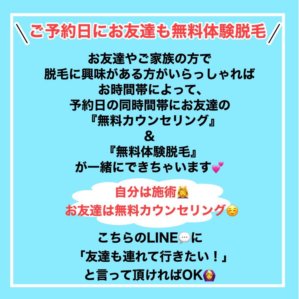 ご予約日にお友達も脱毛が体験出来ちゃいます♪