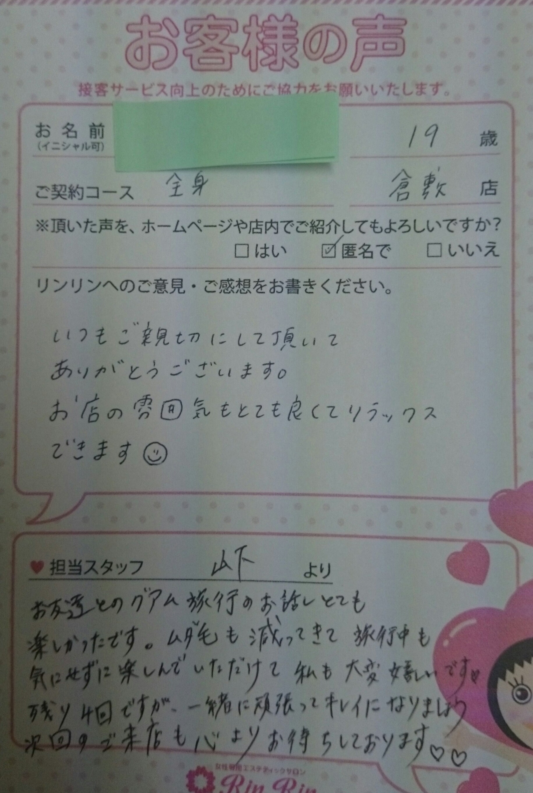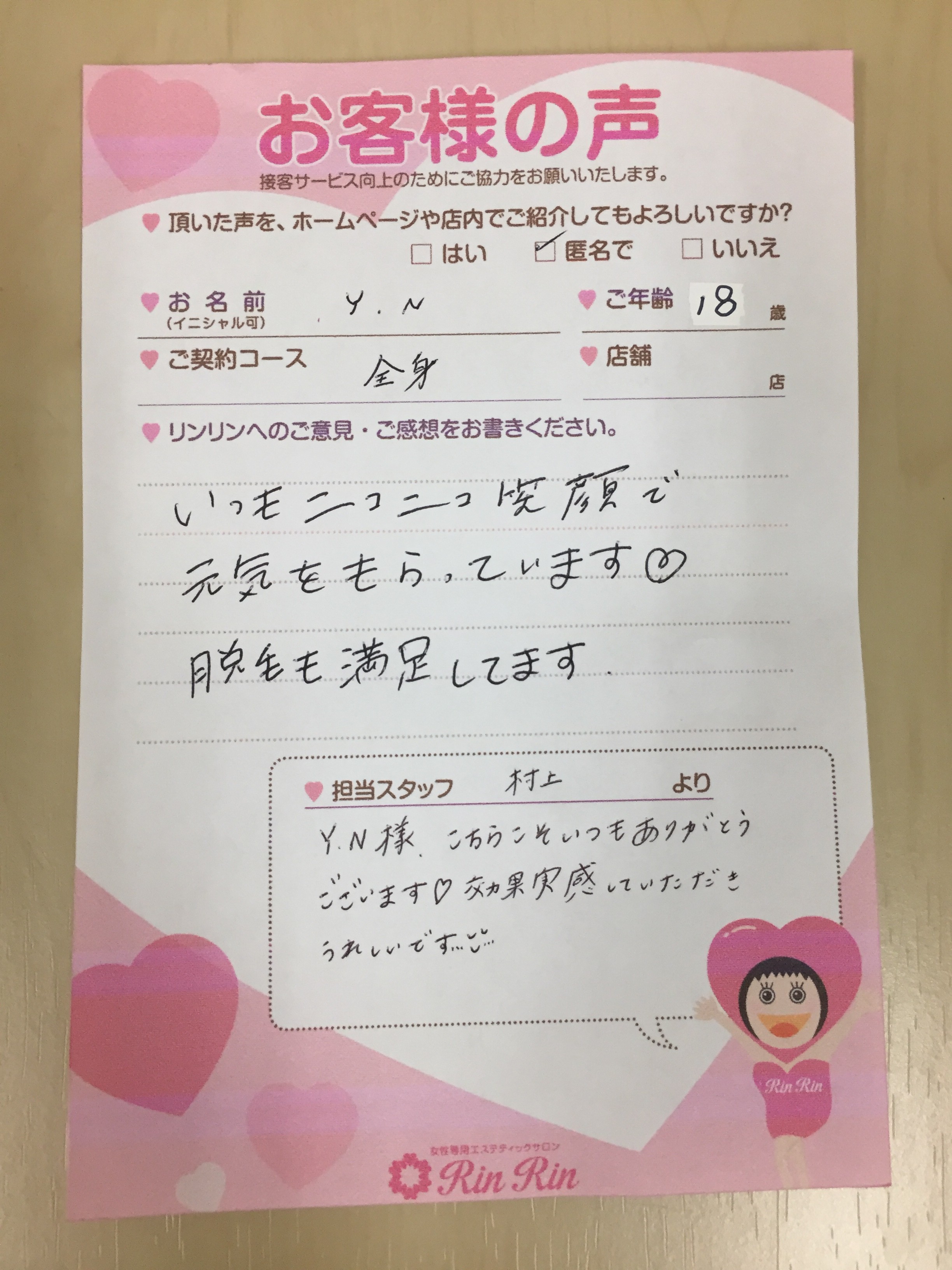 お母様の紹介でご来店下さりありがとうございます。 いつも保湿ケアとUVケアも頑張ってくれてますね、 お客様の声の記入もありがとうございました。部活も頑張って下さいね(^o^)