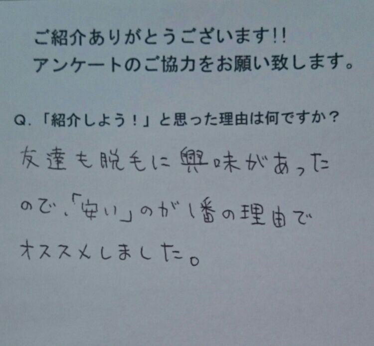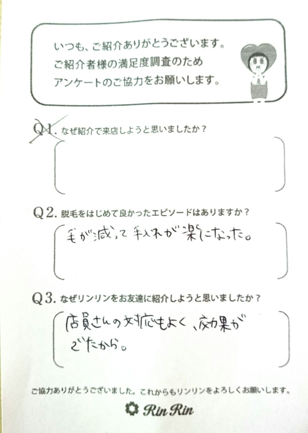 S様 アンケートご協力ありがとうございました。これから後半の回数もっとツルツルになってS様にご満足頂ける様に頑張ります。気になる事などございましたら、いつでもお声掛け下さいませ。