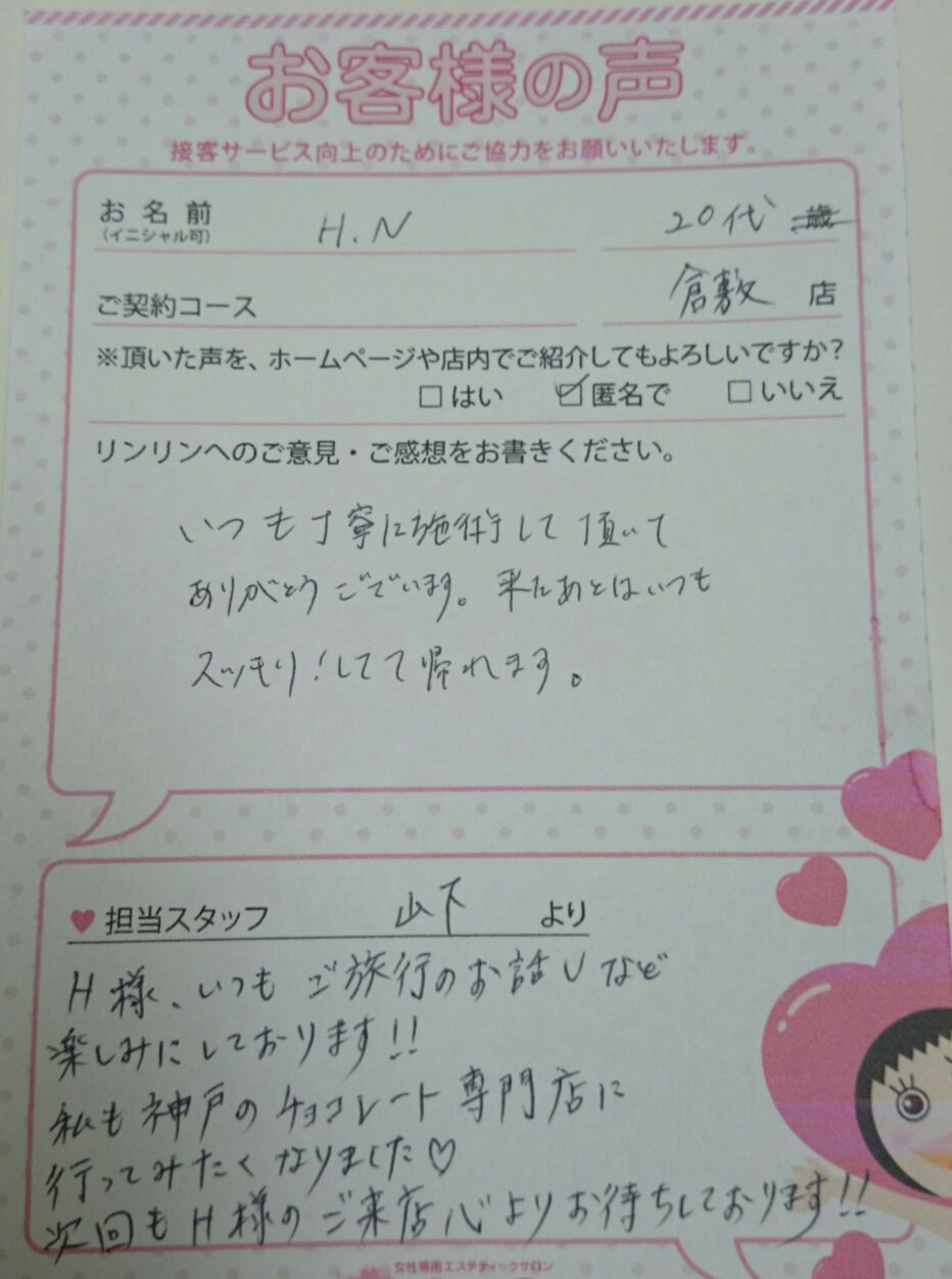 最初のワキのみコースでお願いして、その後VIO、両ヒジ上下、両ヒザ上下お願いしました。いつもていねいに施術して頂いて快く通うことが出来ました。ありがとうございました。