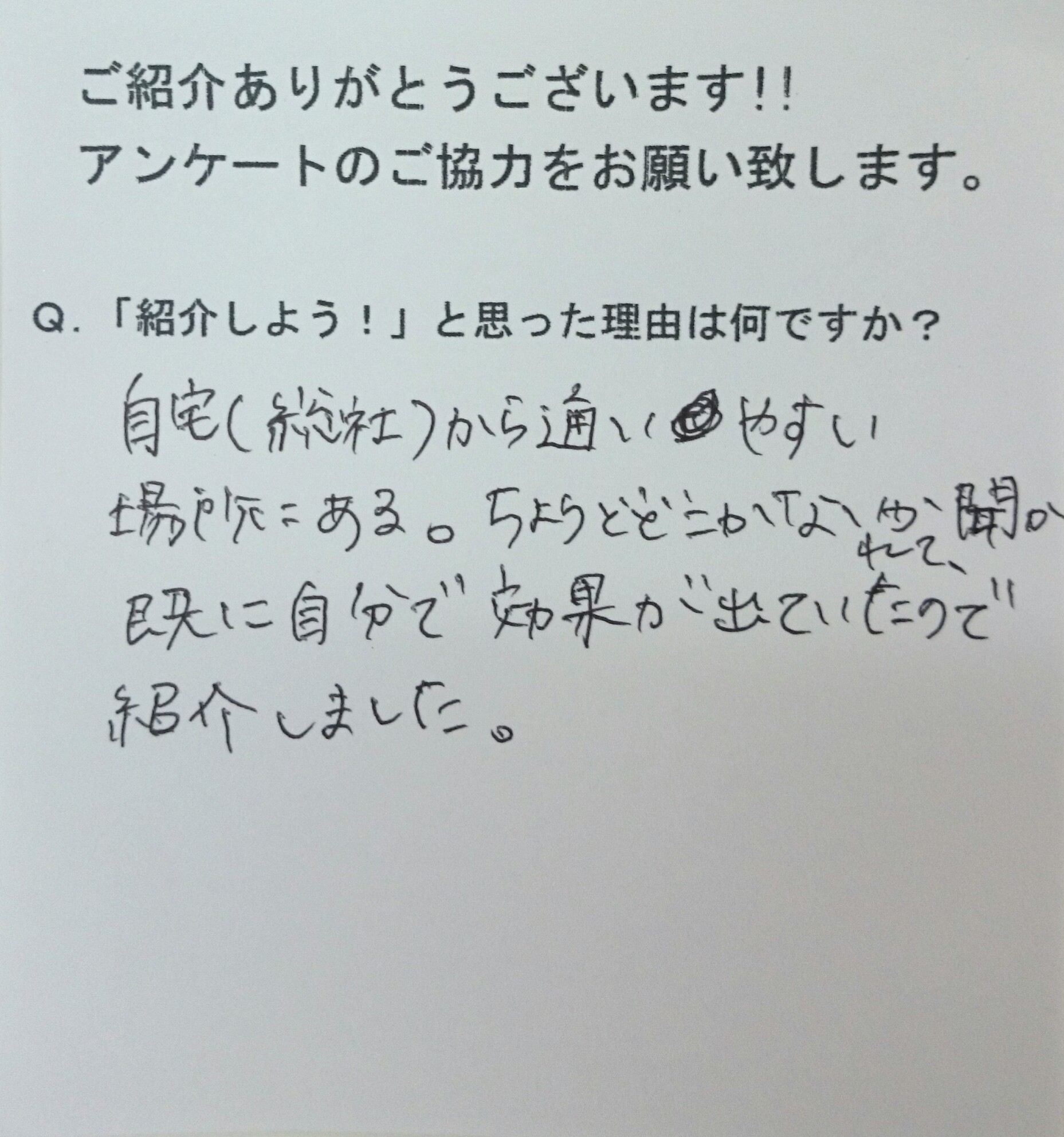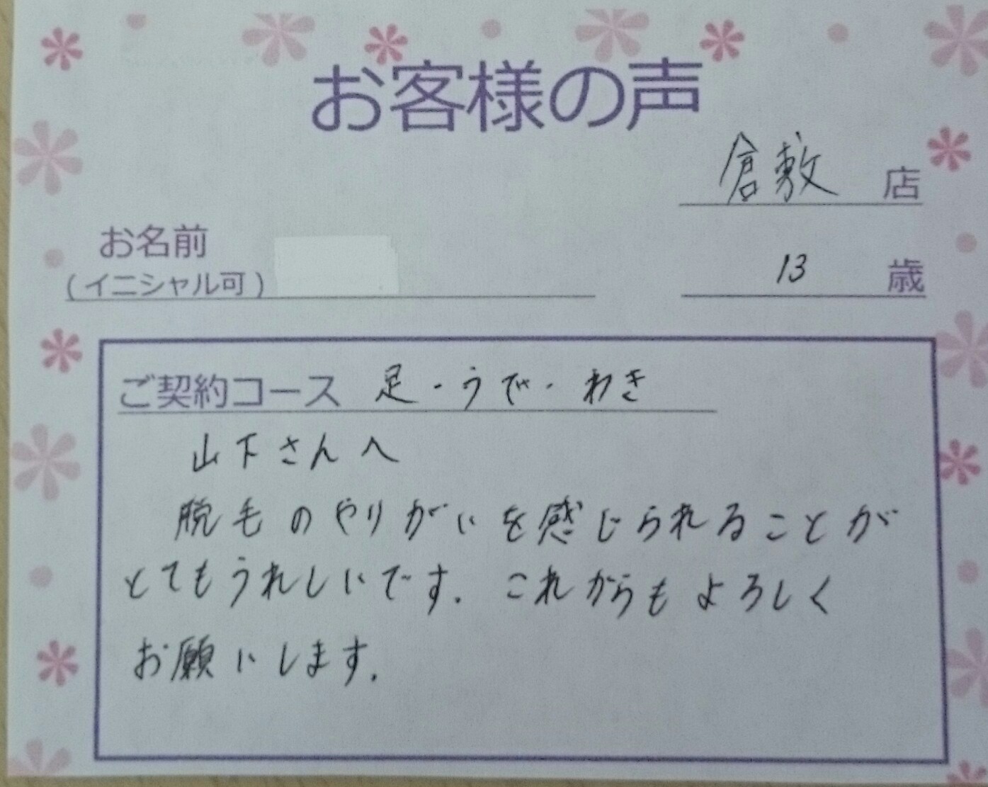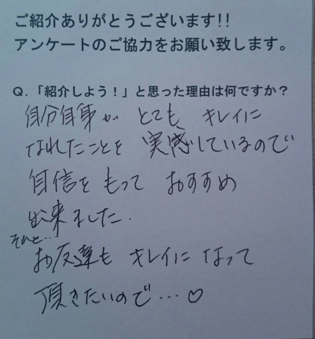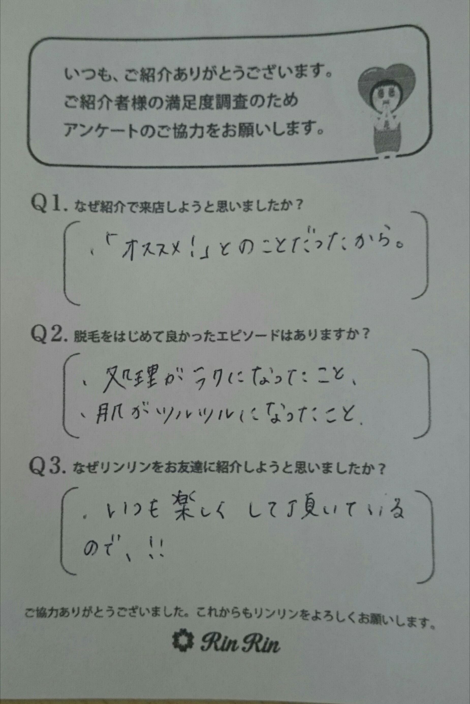 S様 アンケートご協力ありがとうございました。これから後半の回数もっとツルツルになってS様にご満足頂ける様に頑張ります。気になる事などございましたら、いつでもお声掛け下さいませ。