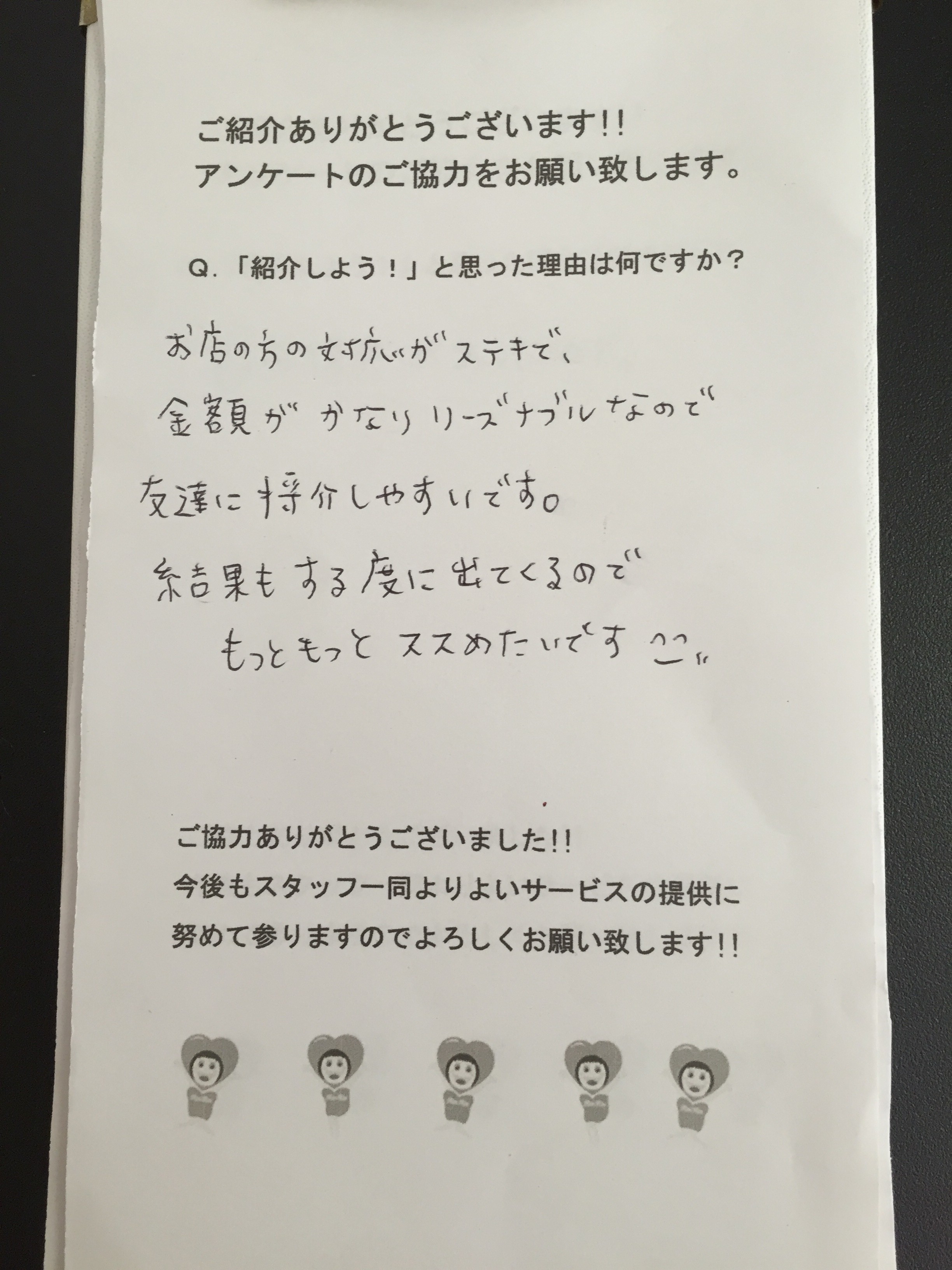 お店の対応がステキで、金額がかなりリーズナブルなので友達に紹介しやすいです。結果もするたびに出てくるのでもっともっとススめたいです。