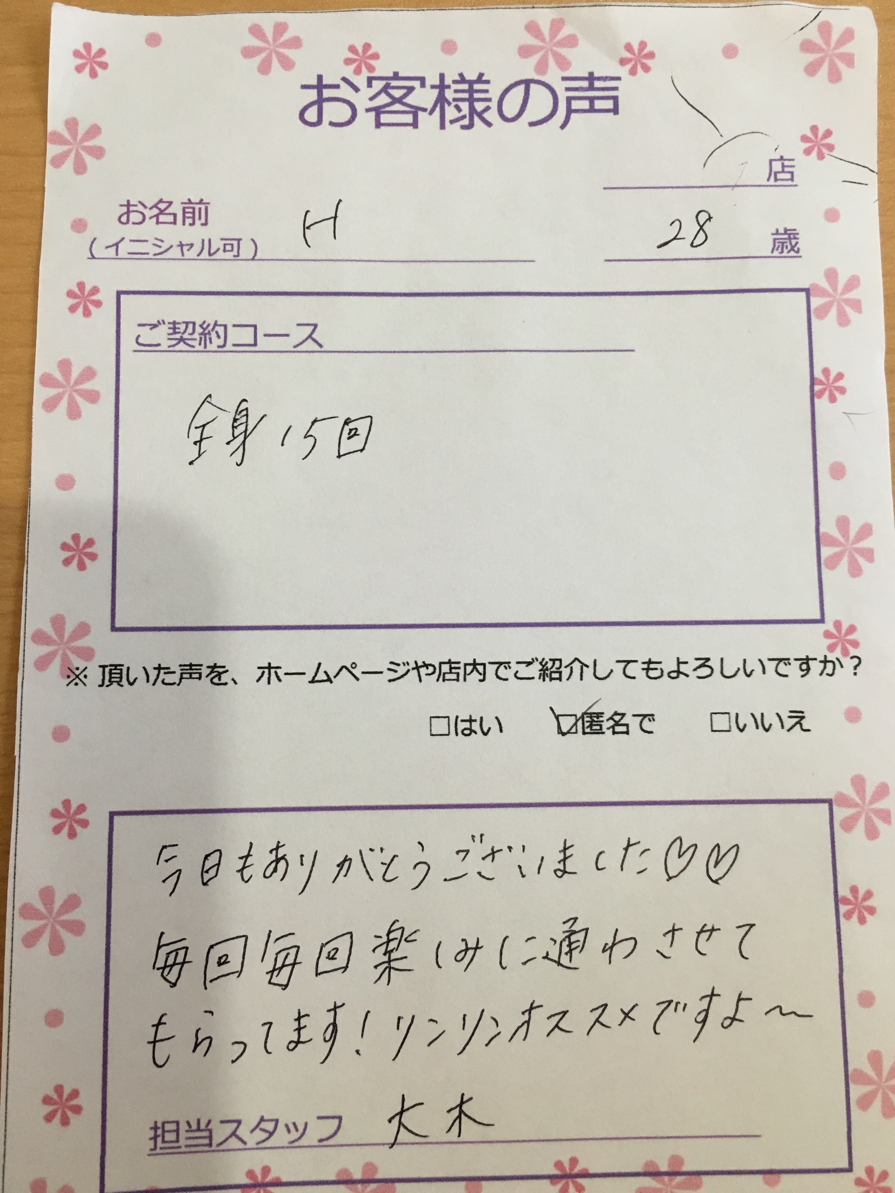 I様、いつもありがとうございます♪嬉しいお言葉も感無量です。ありがとうございます! 今後も楽しく通って頂けるようにスタッフ一同常に新しい事に挑戦していきたいと思っております(*^_^*) 次回もお会いできる事を楽しみにお待ちしております♪