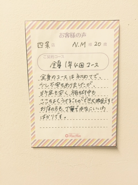 四条店の皆さんこんにちは、お世話になります。わたしは顔の毛(特に鼻下)にすごく悩んでいました。毎日そっても気になり、お父さんの電気シェーバーも持ち出しました。思いきって脱毛をしたら、今では1カ月置いても気にならなくなり、とても嬉しいです!!!