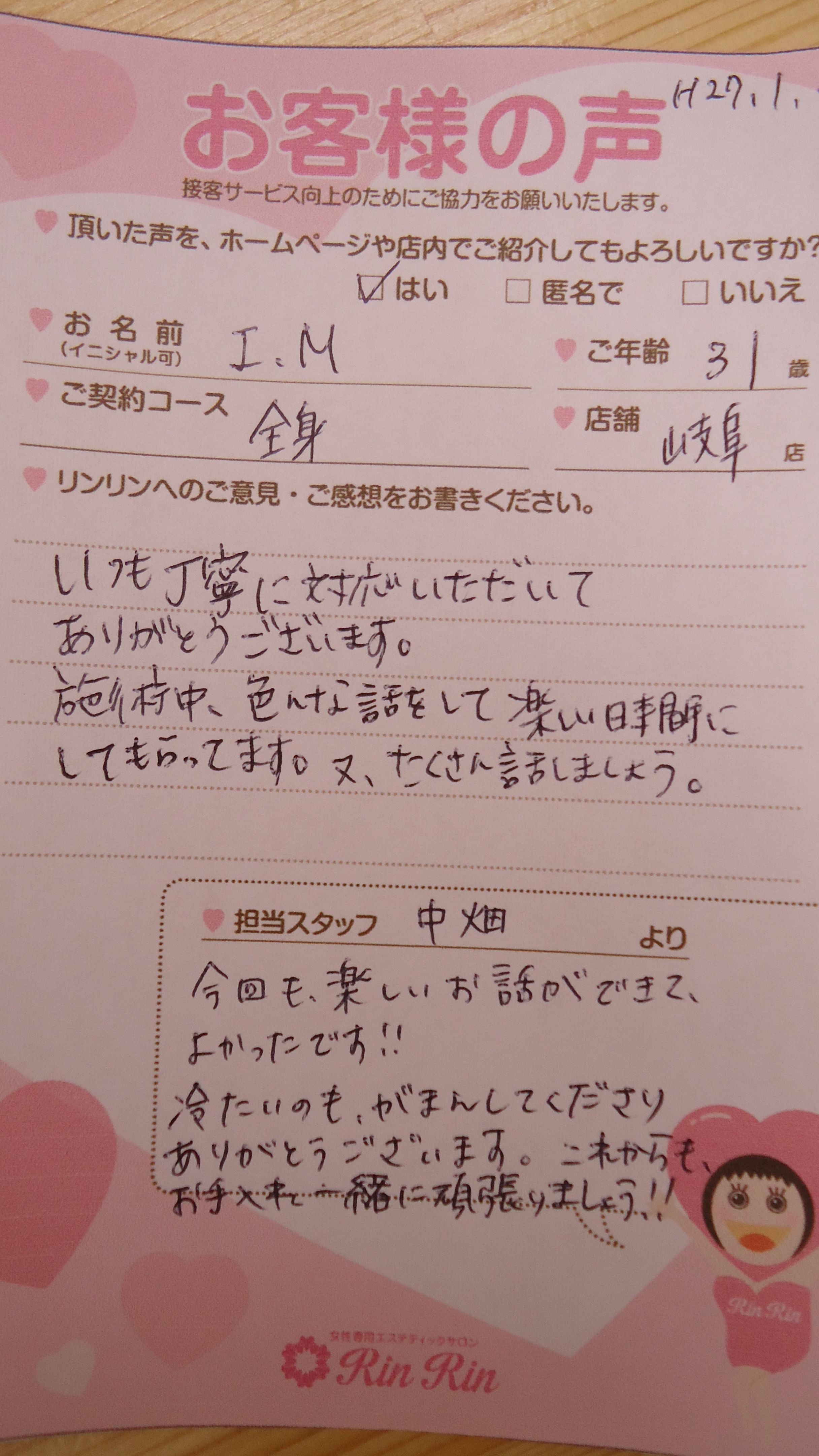 いつもありがとうございます。 お肌とてもキレイになり、スタッフも嬉しいです。 残りの回数は、春日井の店舗で頑張って通って下さいね。
