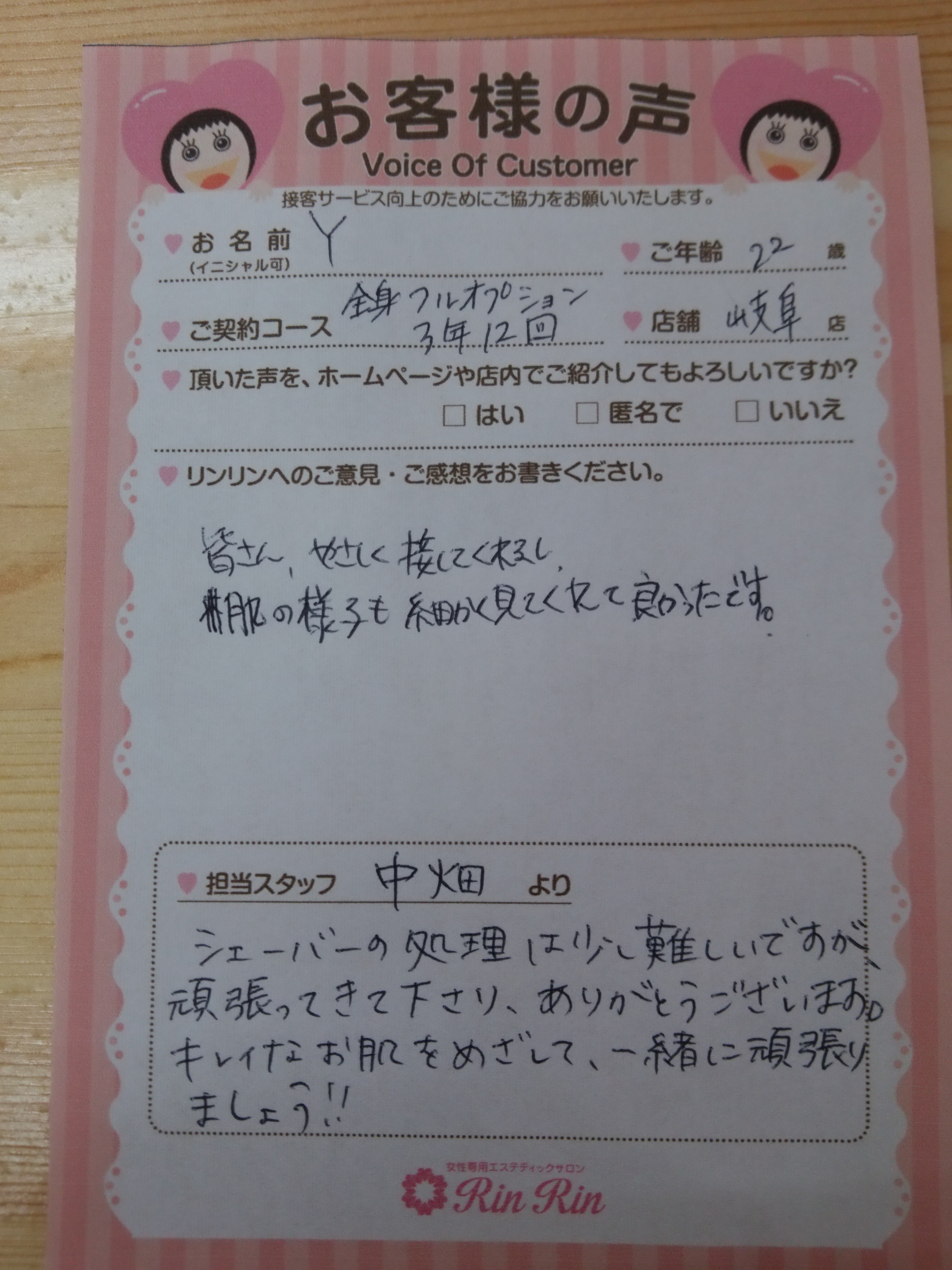 シェーバーでの処理は少し難しいですが、頑張ってきてくださりありがとうございます。 キレイなお肌を目指して、一緒に頑張りましょう!