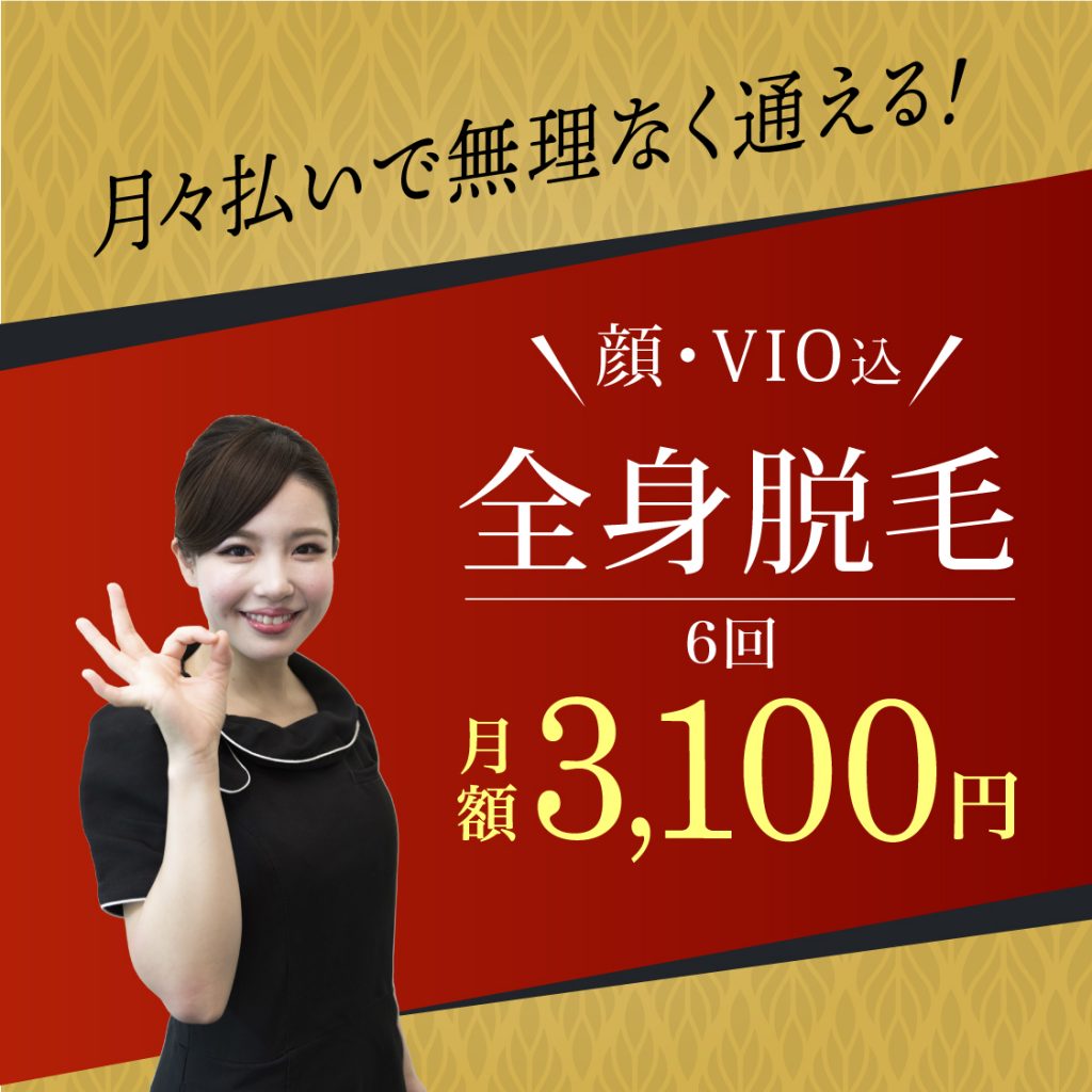 ❤顏・VIO込みの全身脱毛6回が月額3,100円