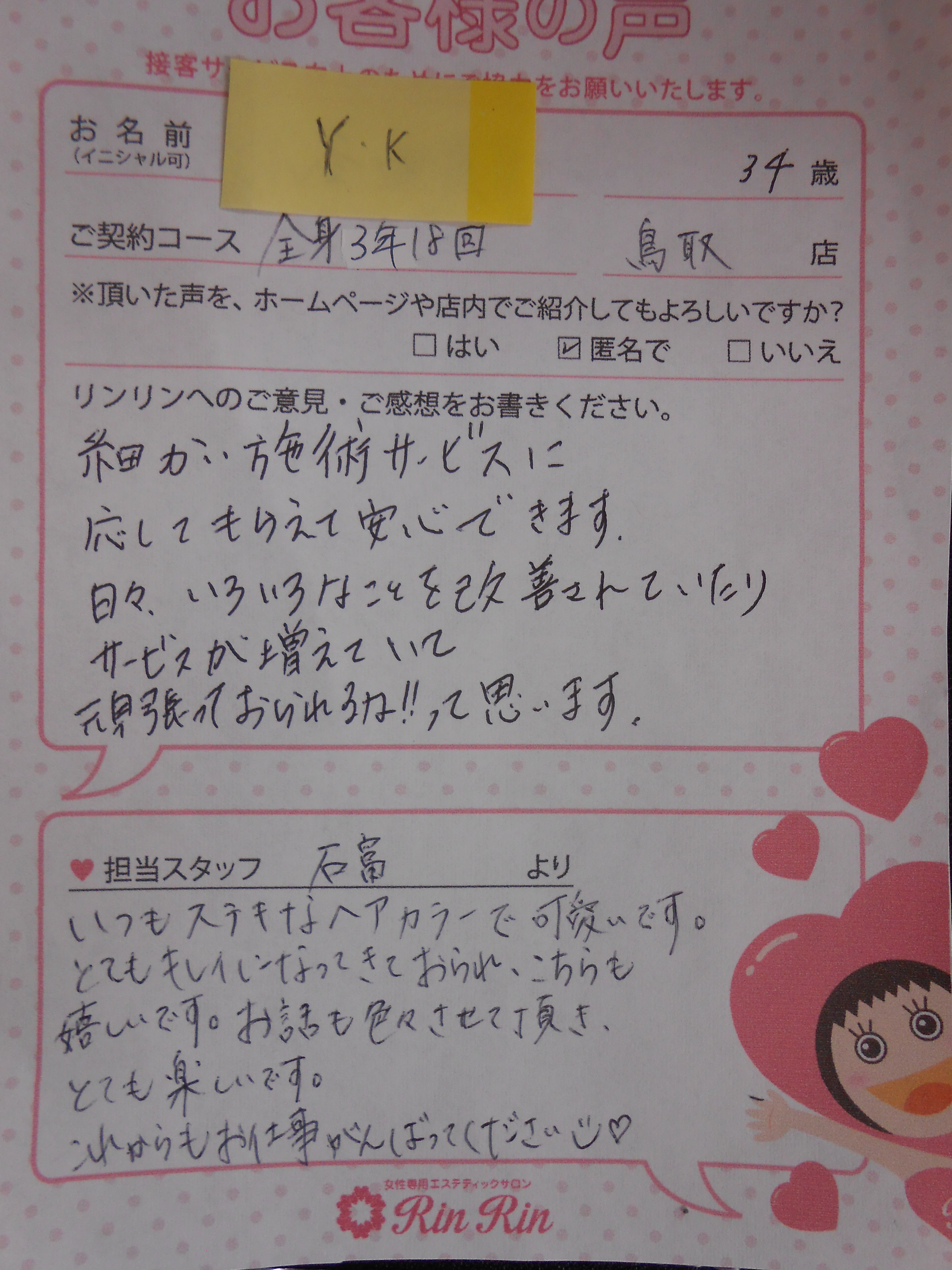 いつもご来店有難うございます。契約手続きの際、『記入しちゃいました♡』と、お客様の声をご記入して頂いてとても嬉しかったです。お待たせしてしまったにも関わらずいつも笑顔で大丈夫ですよ♡と言って下さりとても感謝しております。I様の綺麗♡のお手伝い精一杯させて頂きますので今後とも宜しくお願い致します。 何かあればいつでもご相談くださいませ。