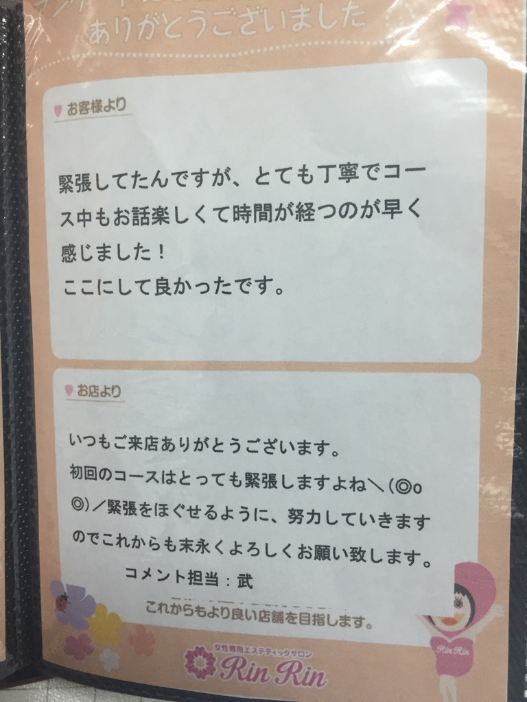 いつもご来店有難うございます。初回のコースはとても緊張しますよね☆緊張をほぐせるように努力していきますのでこれからも末永く宜しくお願い致します。