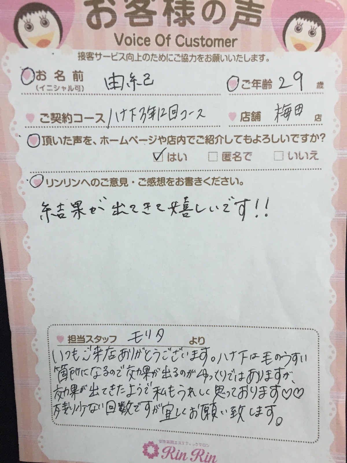 Y様ご記入有難うございます☆効果を実感されて私も嬉しいです。移転されるとのことでさみしいです(T_T)でも!!新しい環境での生活、応援しております❤本日で梅田店での施術が最後だったので新しい店舗での施術宜しくお願い致します(^O^)/