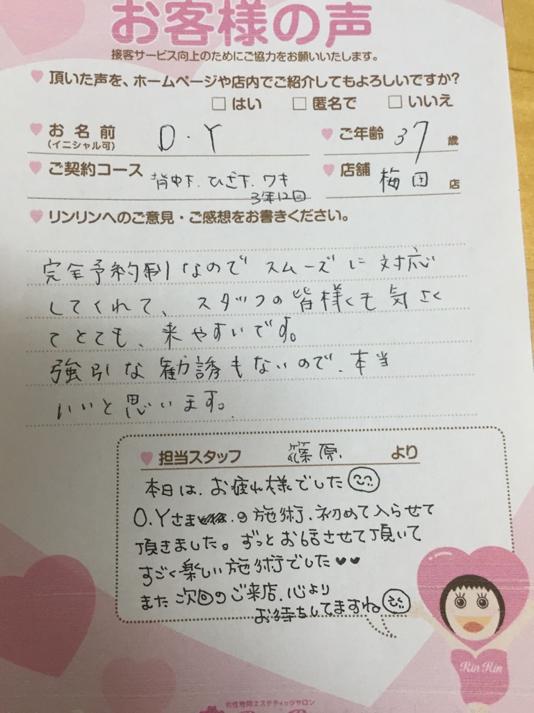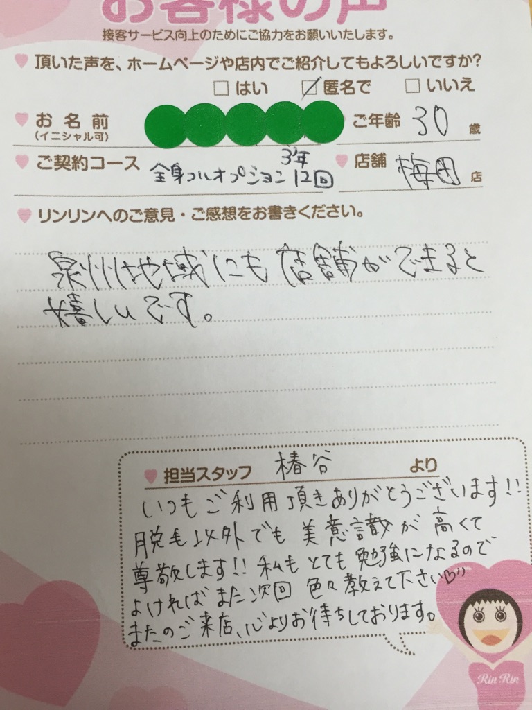 いつも梅田店をご利用いただきましてありがとうございます。初めての脱毛という事で色々ご不安な点もあるかと思います。なんでも聞いてくださいね(^^) これからも一緒にキレイを目指していきましょう!!