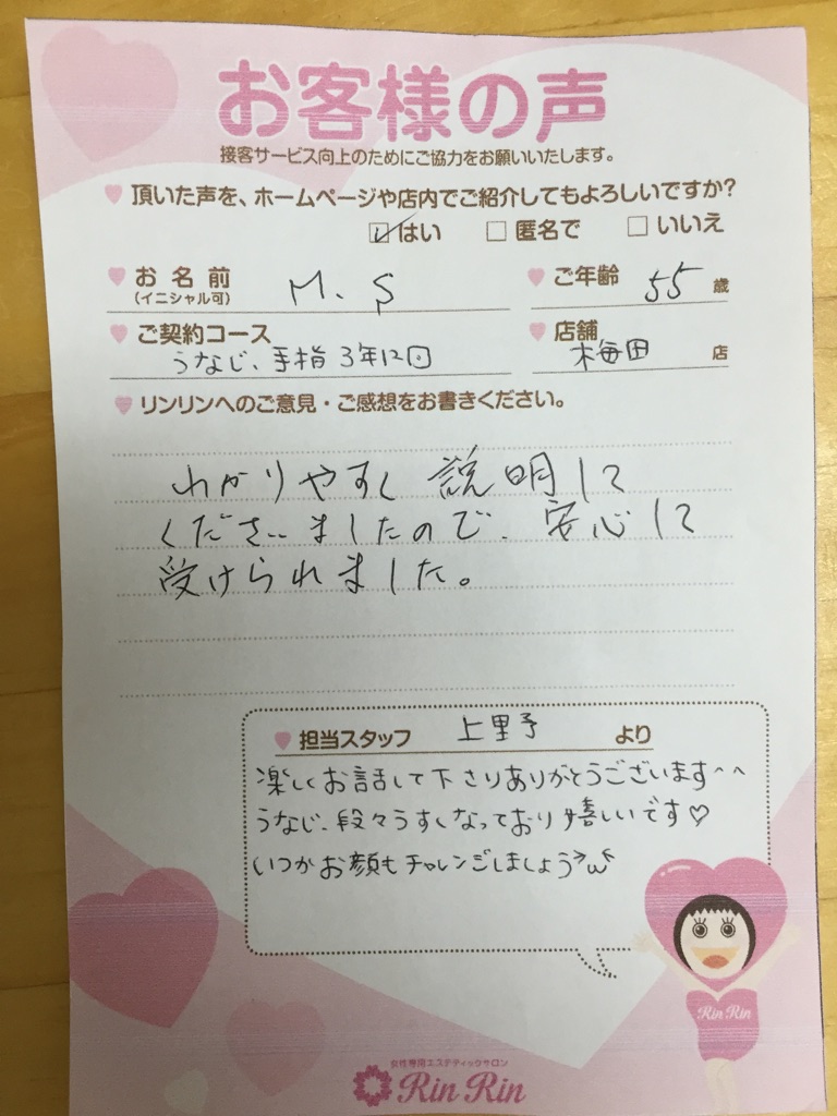 本日はおつかれ様でした。いつもコース中のお話しが楽しく、施術中だとあっという間に終わっています!! また、飼われてらっしゃるワンちゃんのお話ししましょうね♡ 次回のご来店お待ちしております(^O^)/