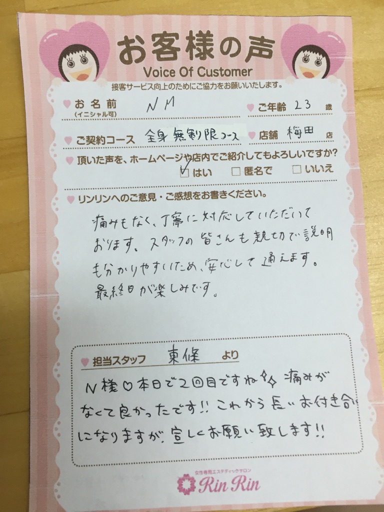 長い期間通って頂きとても綺麗になったようで私もとても嬉しいです。これからもリラックスして施術が受けられるようにスタッフ一同努力していきます。今以上に綺麗を目指しましょう!!