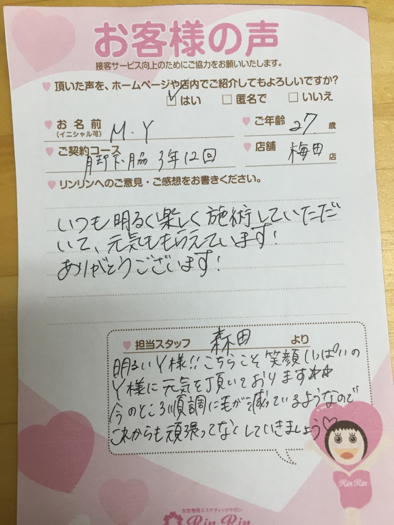 お忙しい中お越しいただきましてありがとうございます。腕下や脚下は本当に毛質も細くなっていて嬉しく思います。これからも宜しくお願い致します。