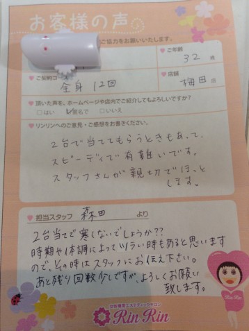 今回担当させていただいた森田です!F様は美意識が高くて、お話をしていて私もすごく楽しいです!F様がもっとご満足していただけるようにスタッフ一同努力いたします!これからも宜しくお願い致します!