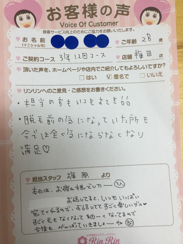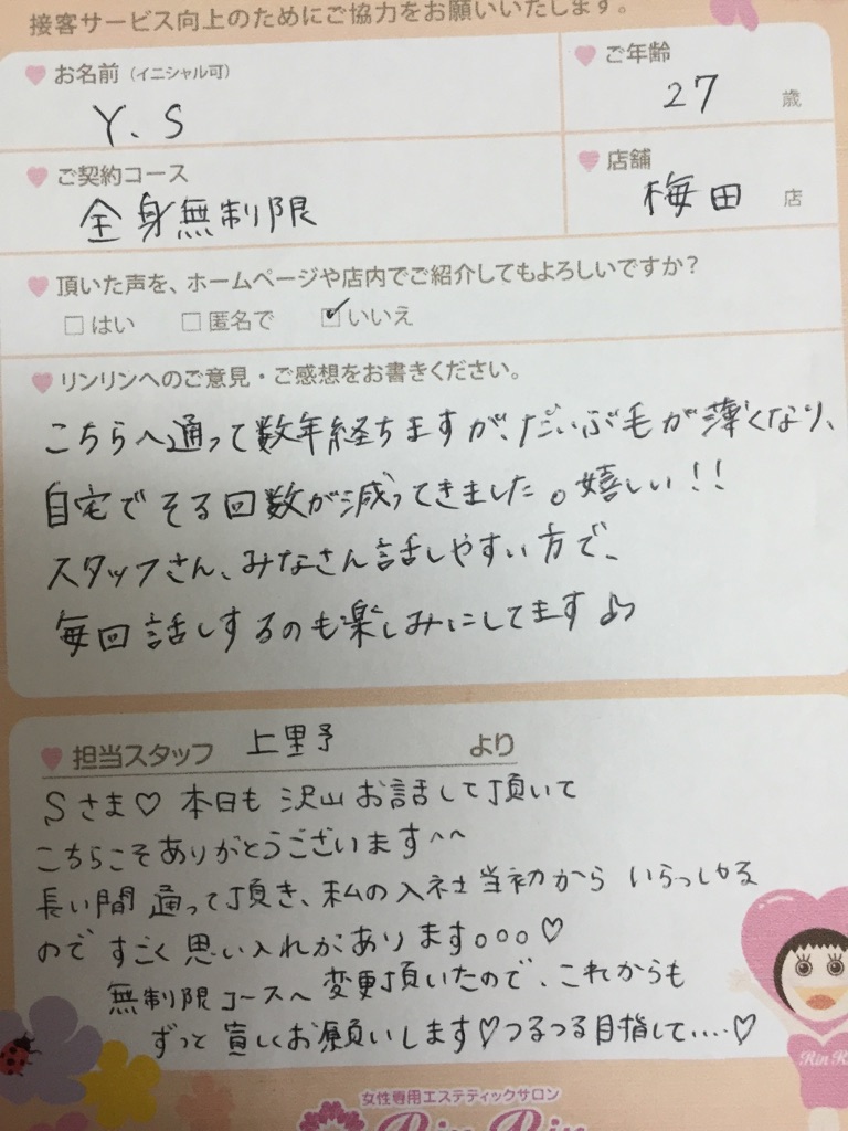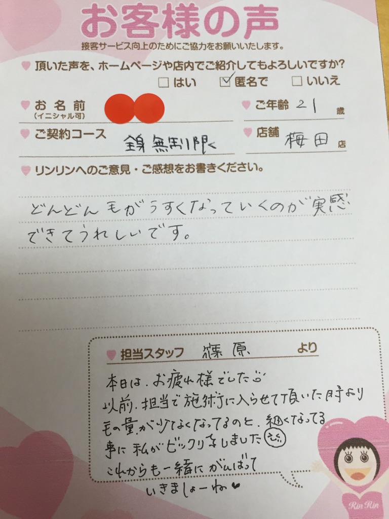 本日はお疲れ様でした。お話ししているといつもたくさん笑って下さるので、お話ししていてとても楽しいです♪ 毛も凄く細くなっていて減ってきているので今後も一緒に頑張りましょうね(^O^)