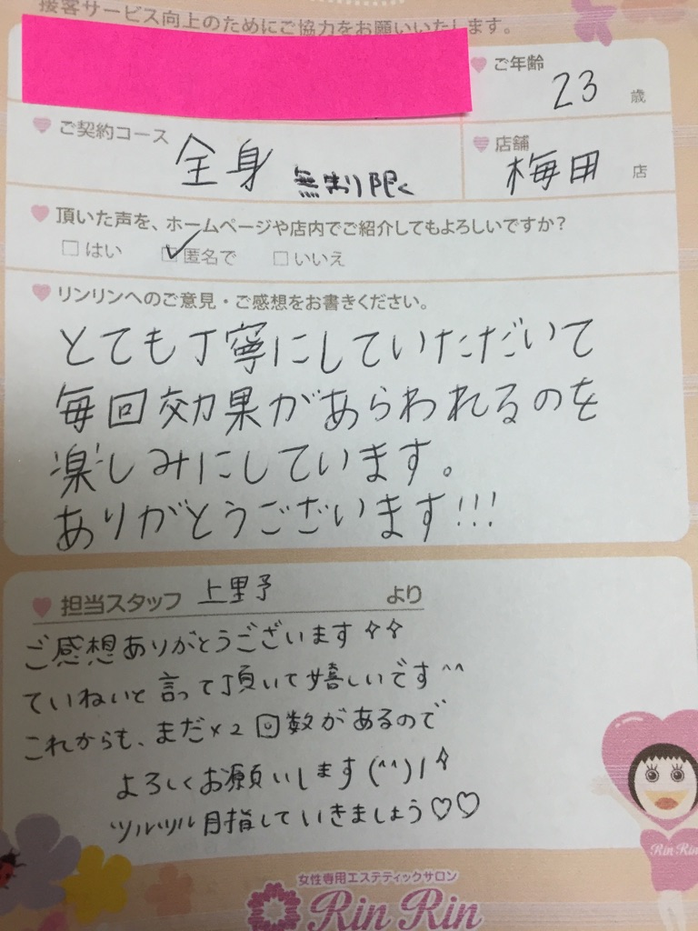 ご感想いただきましてありがとうございます♪丁寧と言って頂けて嬉しいです。 これからもまだまだ回数があるのでツルツル目指して頑張りましょう~