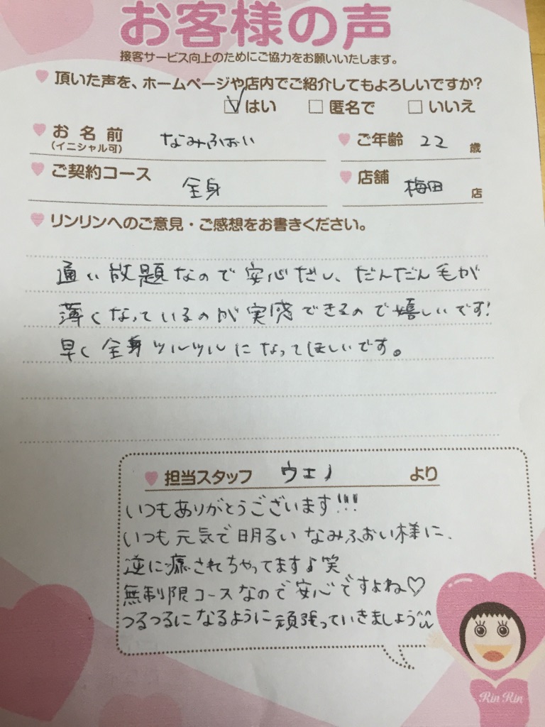 いつもありがとうございます!!いつも元気で明るいなみふぉい様に逆に癒されてしまいます♪(笑) 無制限コースになりますので安心ですね❤ツルツル目指して頑張りましょう~~