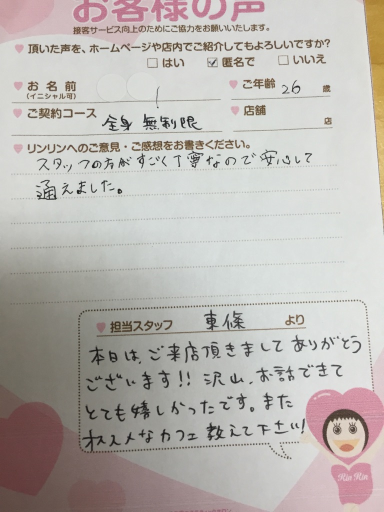 本日もたくさんお話しして頂き有難うございます(^^)長い間通って頂き私の入社当初からいらっしゃるのでとても思い入れがあります・・・♪無制限コースへ変更して頂きましたのでこれからもズット宜しくお願い致します!!!