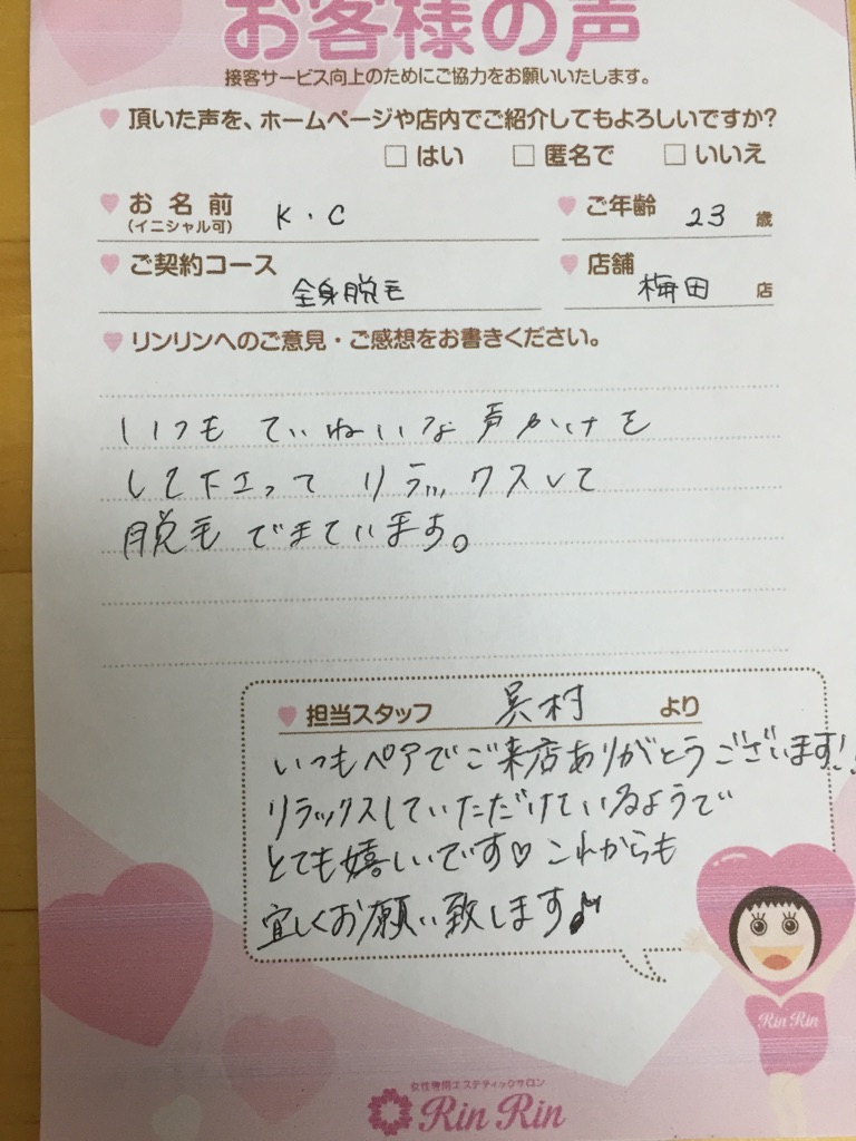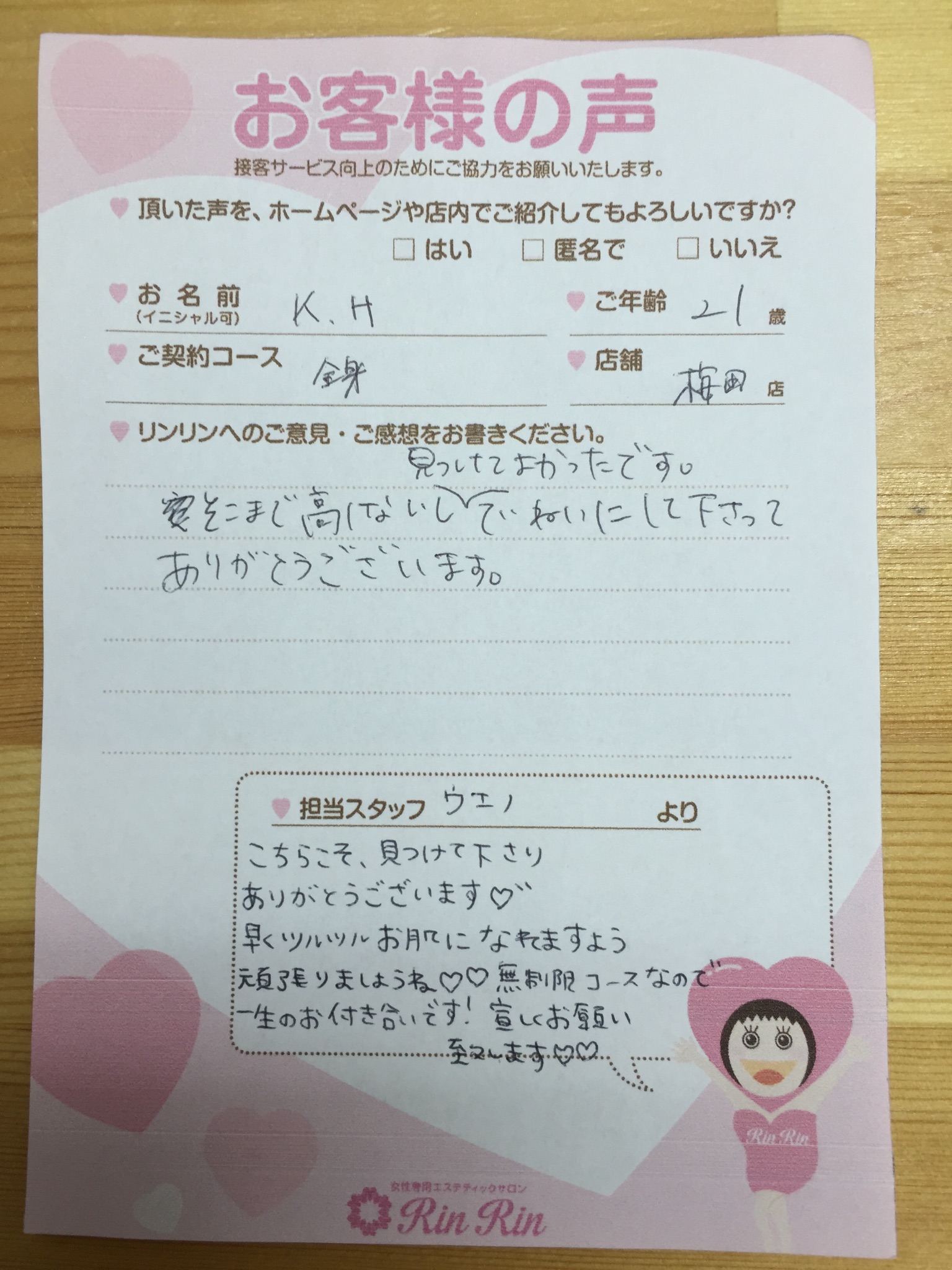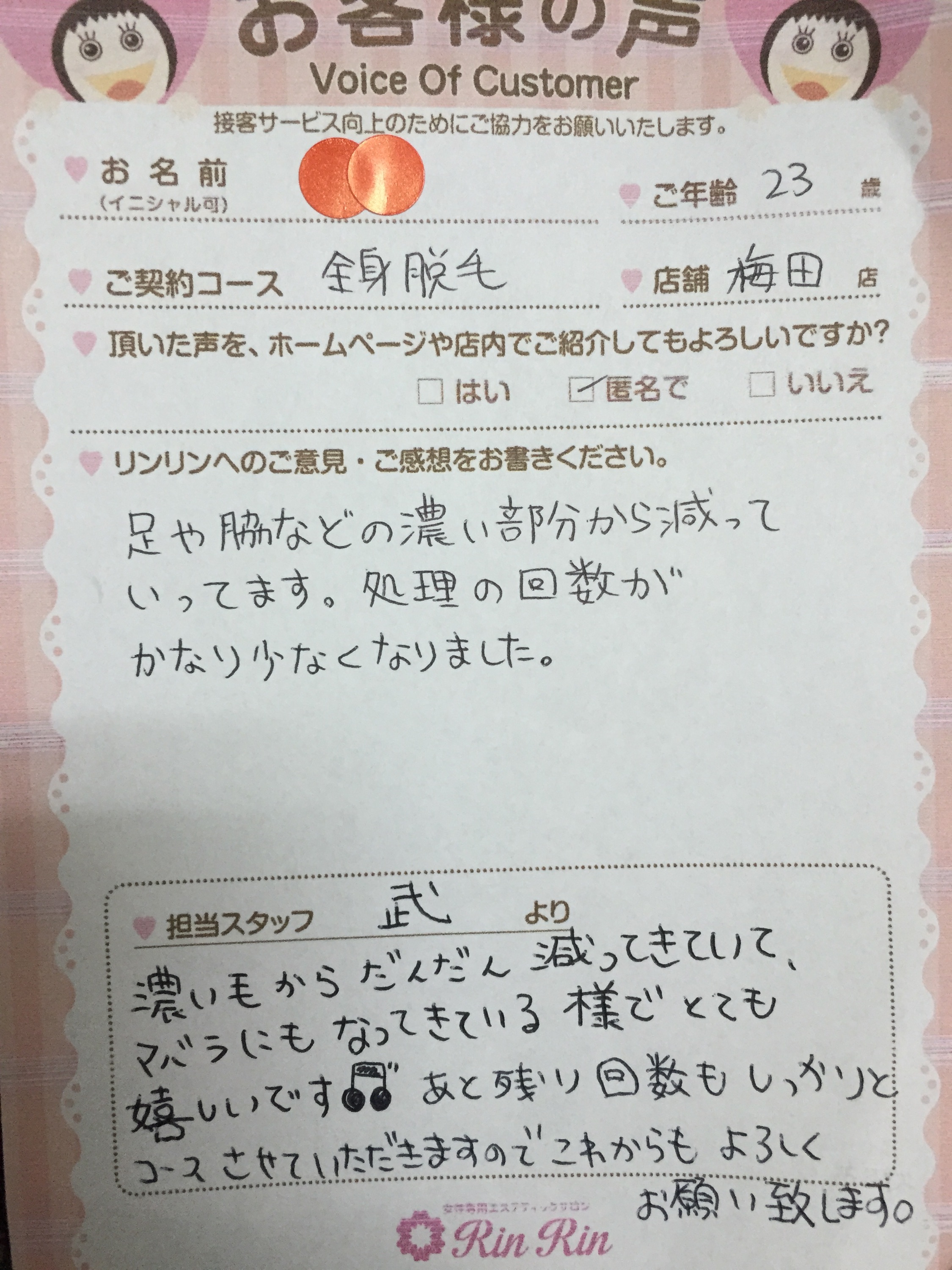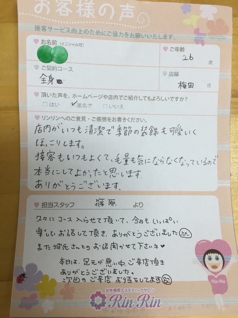 こちらこそ定期的に通っていただき、毛の抜けや 減っているとおっしゃっていただいて嬉しいです。 今回でラストでしたが、又脱毛でお悩みなどあれば すぐご連絡くださいませ!!