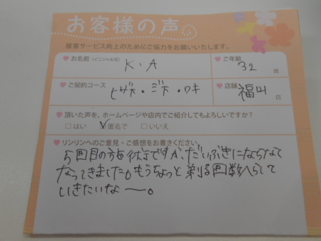 脱毛サロンは初めてでしたが、十分なカウンセリングをしていただき、不安なく施術を受けることができました。ありがとうございました。